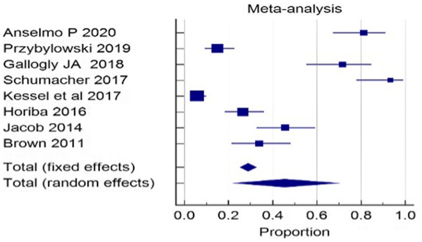 Hearing preservation rate (%) was analyzed using a fixed model effect. The heterogeneity observed was high (I2 = 97%, p < 0.001) in 7 studies. Among the studies, there was a significant difference in the risk of tumor rate (635 participants, RR = 28.76, 95% CI: 25.28–32.42, p < 0.001) (Figures 9, 10). The majority of the articles reported hearing preservation rates in the range of 50–90%. Table 3 highlights the variability in hearing preservation rates across studies, with a high degree of heterogeneity (I2 = 97.22%), underscoring the need for standardization in outcome reporting and study design. Another recent meta-analysis reported a cochlear nerve preservation rate of 73.4% after surgery, which subsequently decreased to 59.9% at the last follow-up (29). This drop in percentage was reported to be 25% in a study by van de Langenberg et al., and 100% in another study by van de Langenberg et al. (30). These varied percentages of hearing preservation may be due to different pre-therapy rates, which may not be necessarily linked to the size of the tumor. This may be due to the different approaches taken by the treating clinician, for whom hearing preservation may be a primary or a secondary outcome (29). Secondary outcomes were varied, such as imbalance and gait, tinnitus, trigeminal neuralgia, hydrocephalus, ipsilateral facial nerve palsy, thalamic stroke, and transient facial paralysis. However, the percentage of patients who suffered such complications was quite low.
