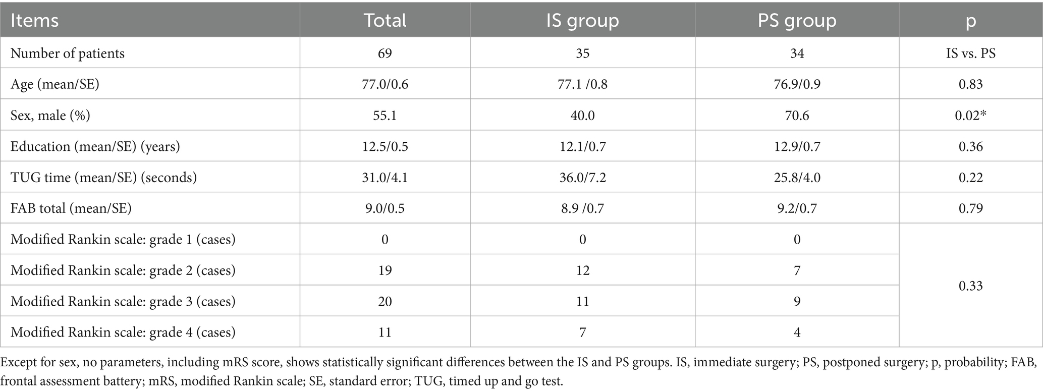 Among the 102 potential patients, nine were eliminated owing to deviations from the inclusion criteria. Among the 93 patients included in this study, 83 completed the 12-month follow-up (45 in the IS group and 38 in the PS group). In the PS group, data obtained 3 months after registration were considered as the preoperative data. To examine the association between gait, assessed by TUG, and frontal lobe function, assessed by FAB, we selected patients with available preoperative and 12-month postoperative TUG and FAB data. In the IS group, three and seven patients were excluded due to the unavailability of preoperative and 12-month postoperative data, respectively. In the PS group, one and three patients were excluded due to the unavailability of preoperative and 12 months postoperative data, respectively. Consequently, 69 patients were enrolled in this study, 35 in the IS group and 34 in the PS group. Among them, one participant lacked 3-month postoperative data, and four lacked 6-month postoperative data (Figure 1B).