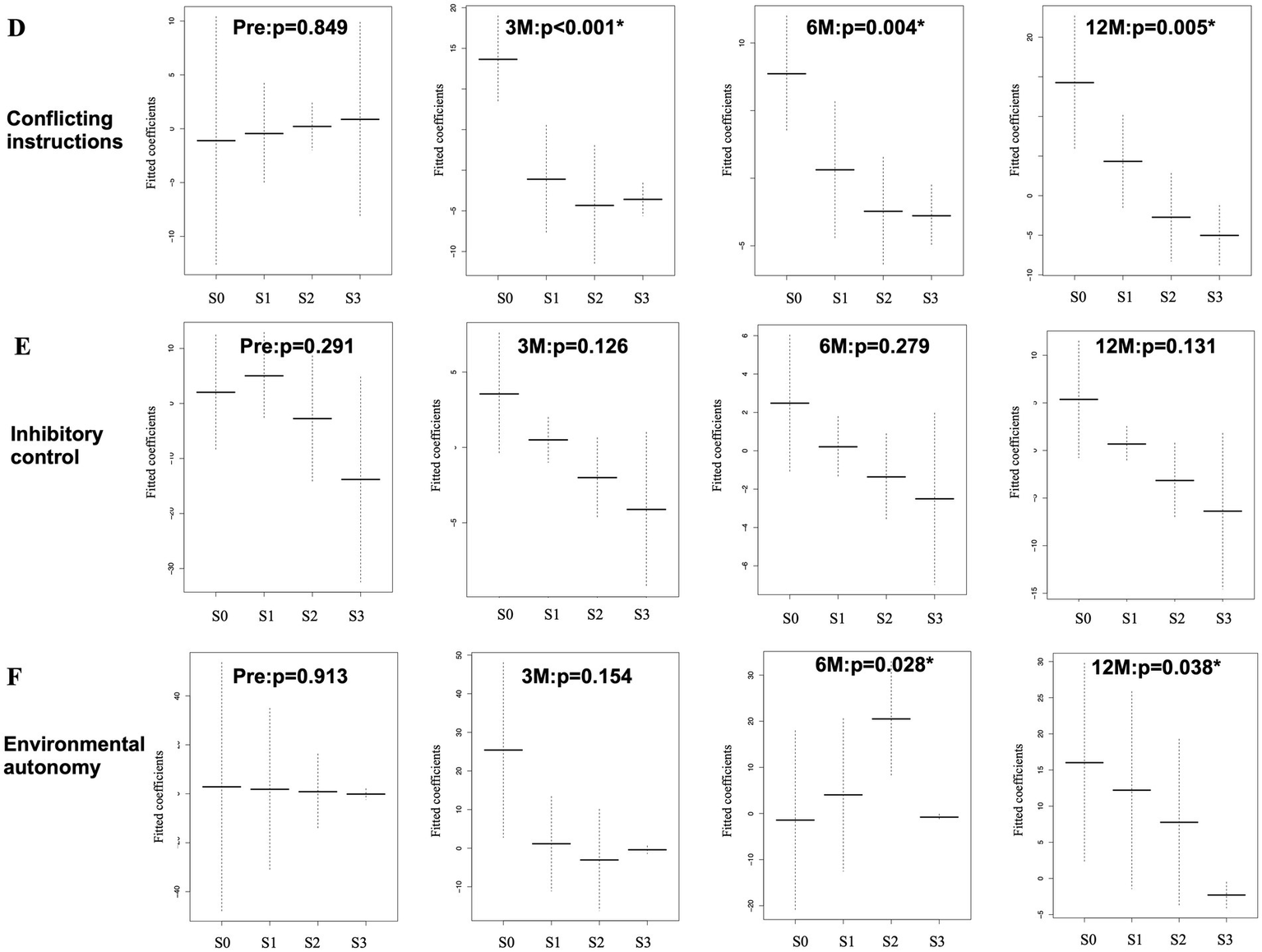 Association between TUG time and FAB ordinal task scores (A–C), which was analyzed using GAM with an ordinal smoothing penalty. The “conceptualization” task (A) shows no statistically significant association with TUG time both at pre- and post-operative states. The “verbal fluency” task (B) shows a statistical significance at 12 months after surgery. The “motor programming” task (C) shows statistically significant associations at 3, 6, and 12 months. G: grading, p: probability, Pre: preoperative state, 3 M, 6 M, 12 M: 3, 6, and 12 months after surgery. Y-axis, fitted coefficients, dotted line: 95% confidence interval, X-axis, ordinal score(S); S0 to S3, *: statistical significance.