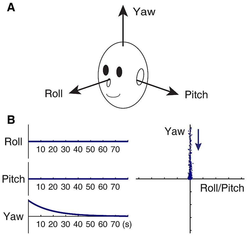 Figure 1. Model-based characterization of normal upright. (A) Head-fixed coordinate frame of reference. (B) Idealized slow phase velocity of OKAN subsequent to yaw OKS (zero input response) in an upright position, plotted against time in seconds (left panels), and the same plotted in the roll/pitch-yaw plane (right panel). The time constant of decay in yaw is set to 18 s. In the right panel, each dot represents slow-phase eye velocity sampled at a rate of four per second. The dots are separated by artificially injecting noise in the data to facilitate visualization of spatio-temporal progression in the direction indicated by the arrow. As a result, initial fast and later slow changes are represented by a sparse and dense display of dots, respectively.