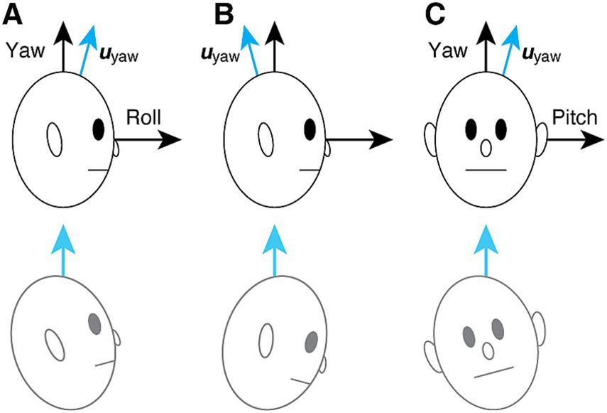 where the velocity storage time constants for rotations about the head roll, pitch, and yaw axes are negatively and reciprocally related to the corresponding diagonal elements, e.g., the time constant for the yaw component is given by −1/hyy. The roll and pitch time constants are usually several-fold shorter than the yaw time constant and closer to those of primary afferents when gravity is aligned with the yaw axis (46–48). Eigenvectors uroll, upitch, and uyaw of H0, respectively, represent the velocity storage estimate of the head roll, pitch, and yaw axes, aligned with the actual head roll, pitch, and yaw axes. In particular, uyaw defines the subjective “up” direction.