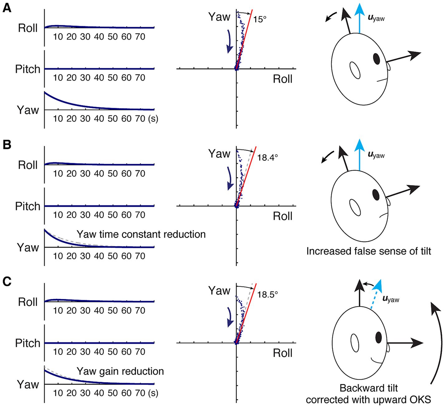 resulting in uyaw to deviate from the head vertical by 18.4° per Equation 1, representing an increase in the false sensation of tilt by 24% (Figure 3B). In terms of zero-input response, the faster decline in the yaw component also results in a slightly faster peaking time in the roll component, but the decay profile in the roll-yaw plane becomes stabilized with a larger contribution from the roll component than before the yaw time constant reduction.