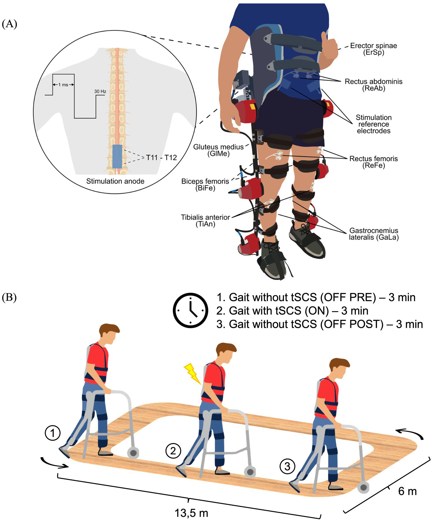 Schematic representation of the experimental setup (A) and experimental protocol (B). (A) Bipolar EMG electrodes were placed over the following muscles: Erector Spinae (ErSp), Rectus Abdominis (ReAb), Gluteus Medius (GlMe), Rectus Femoris (ReFe), Biceps Femoris (BiFe), Tibialis Anterior (TiAn) and Gastrocnemius Lateralis (GaLa). For the application of tSCS, reference electrodes were placed over the iliac crests and the stimulation anode was positioned at the T11-T12 spinal level, delivering a waveform at 30 Hz with a 1 ms pulse width. (B) The protocol consisted of two randomized sessions (with and without the Exo-H3), each divided into three phases: 3 min of gait without stimulation (OFF-PRE), 3 min of gait with tSCS (ON) and 3 min of gait after stimulation (OFF-POST). Exo-H3, exoskeleton; tSCS, transcutaneous spinal cord stimulation.