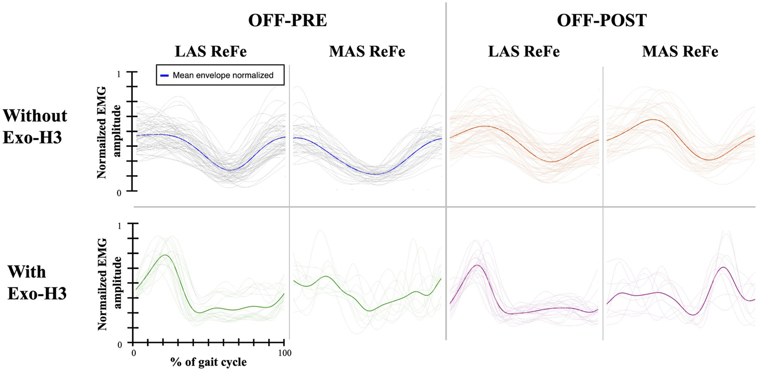 EMG envelopes and mean envelope (highlighted with a thicker line) across the gait cycle for Participant 1. Data are shown for the ReFe muscle on both the less affected side (LAS) and most affected side (MAS) under four conditions: OFF-PRE without Exo-H3 (blue), OFF-POST without Exo-H3 (orange), OFF-PRE with Exo-H3 (green) and OFF-POST with Exo-H3 (purple). The X- and Y-axes are consistent across all plots. EMG, electromyography; Exo-H3, exoskeleton device; ReFe, rectus femoris; tSCS, transcutaneous spinal cord stimulation; OFF-PRE, walking trial before the application of tSCS; OFF-POST, walking trial after the application of tSCS.