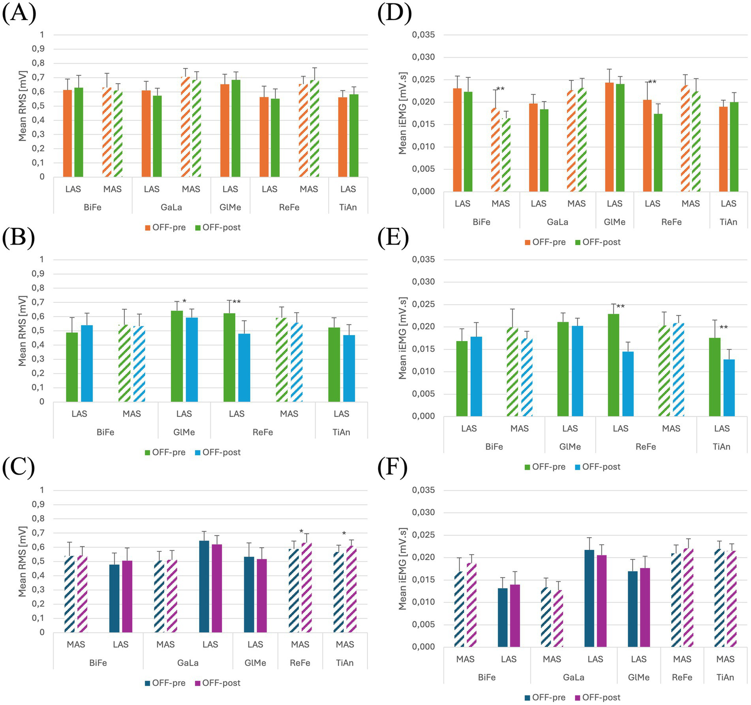 Plots of the mean and standard deviation of RMS (left) of (A) Participant 1, (B) Participant 2 and (C) Participant 3 and iEMG (right) of (D) Participant 1, (E) Participant 2 and (F) Participant 3 for both OFF-PRE and OFF-POST conditions in the session with Exo-H3. * p < 0.05; ** p < 0.001. The position of LAS and MAS is related to whether the less or most affected side correspond to the left or right side of each participant. RMS, Root Mean Square; iEMG, integrated EMG; tSCS, transcutaneous spinal cord stimulation; OFF-PRE, walking trial before the application of tSCS; OFF-POST, walking trial after the application of tSCS; Exo-H3, exoskeleton device; LAS, less affected side; MAS, most affected side.
