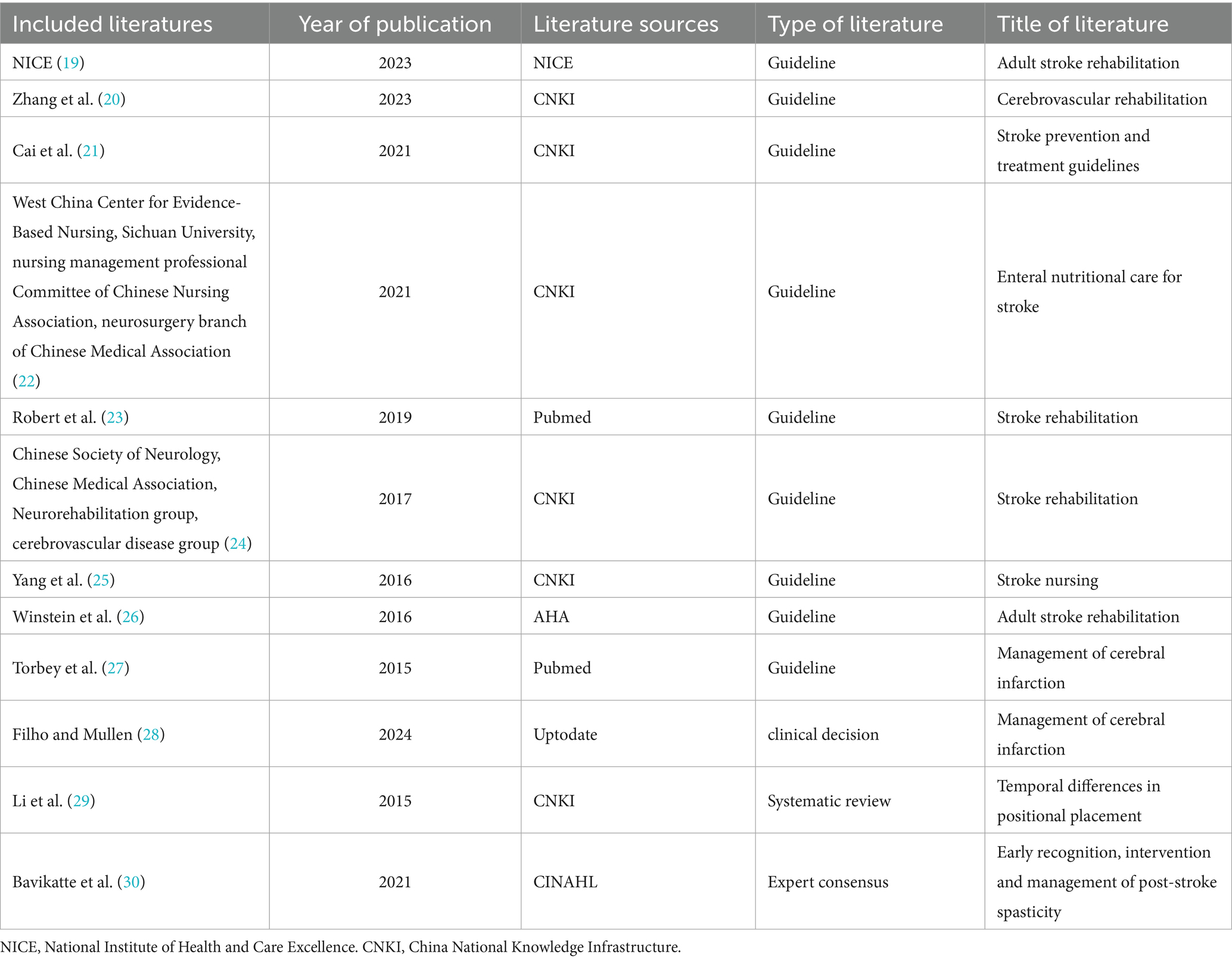 The inclusion criteria were as follows: (i) Studies focused on positioning management, spasticity management, and dyskinesia management in stroke patients, (ii) Studies including clinical guidelines, expert consensus statements, evidence summaries, and systematic reviews, (iii) Studies published in both Chinese and English languages.