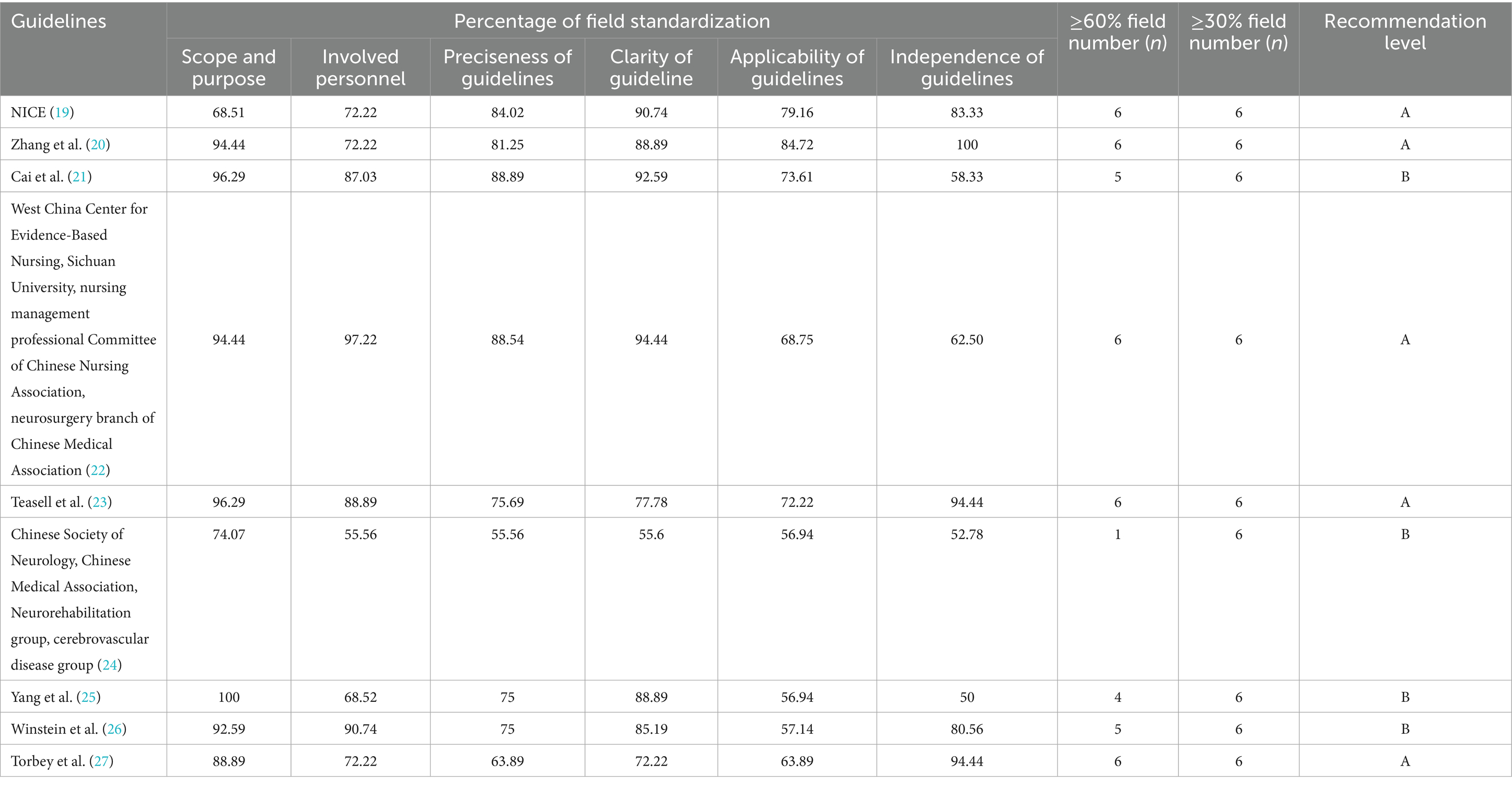 The guidelines were evaluated using AGREE II and the results are shown in Table 2, all with a recommendation level of A or B. The overall quality was high and inclusion was granted.