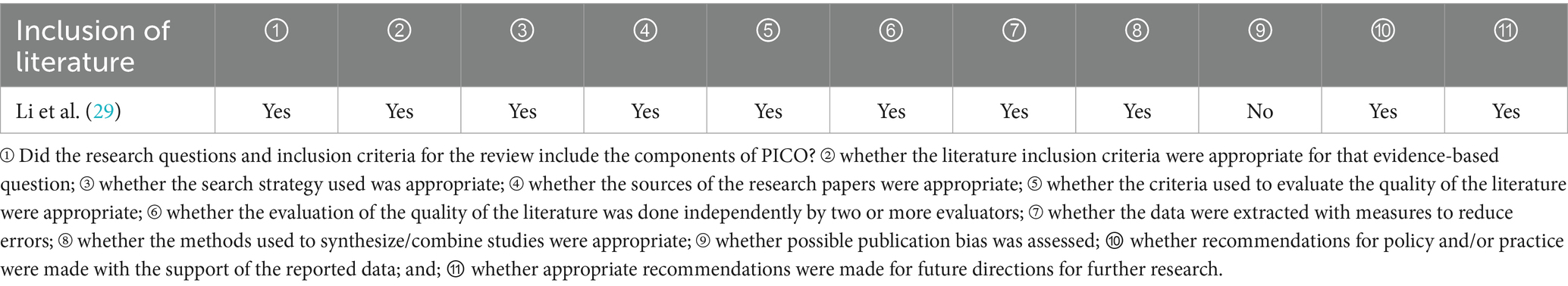 One systematic review (29) was included in the study. The evaluation results can be found in Table 3.