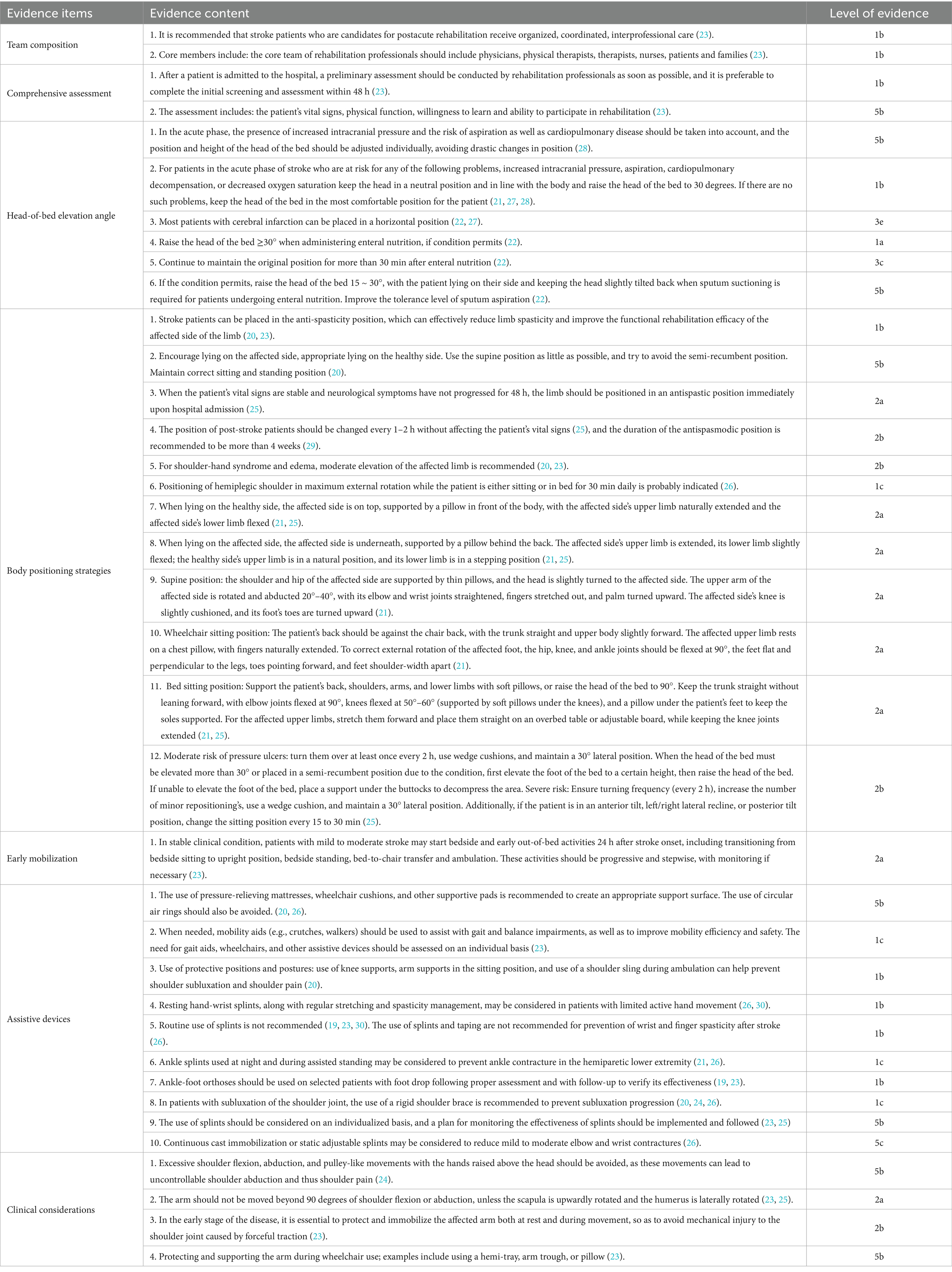 Conclusion: This study summarizes the best evidence for positional management of stroke patients, which provides an evidence-based basis for standardizing stroke positional management. However, the best evidence should be used in an individualized manner with comprehensive consideration of the actual clinical situation when the evidence is applied in order to improve the clinical outcomes and quality of life of stroke patients. In the future, it should also be combined with multi-sample and multi-center studies to validate its effect, as well as to further enrich the content of stroke position management.
