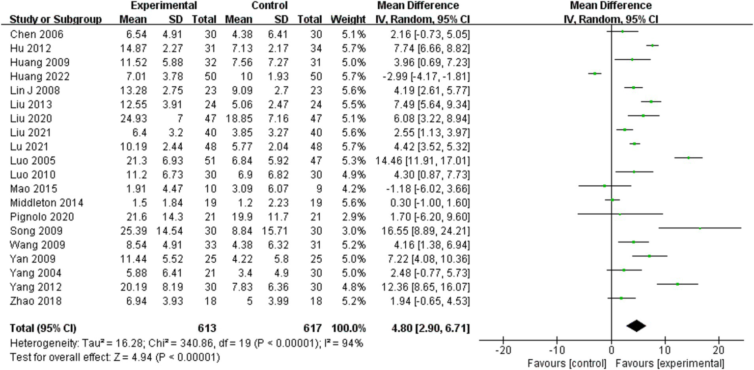 Fugl-Meyer assessment of lower extremity scores was analyzed for 20 of the 25 included studies (10, 11, 22, 24–29, 31–39, 41, 42). A random effects model was employed for the meta-analysis due to the significant heterogeneity of the combined results (I2 = 94%). The combined effect size significantly enhanced the Fugl-Meyer assessment of lower extremity scores for the BWSTT group relative to the control group (MD = 3.60, 95% CI: 1.23–5.98, p = 0.003). Figure 2 presents the results.