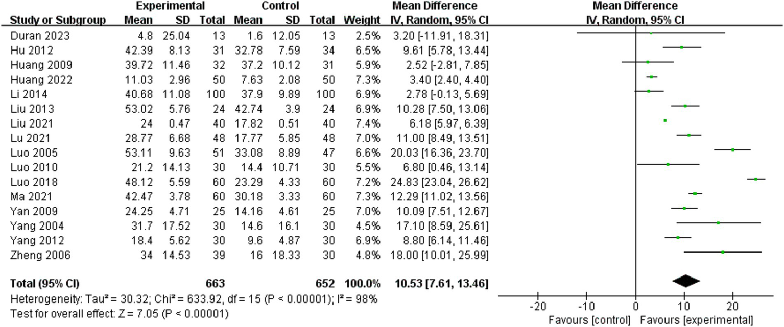 Barthel Index scores were analyzed for 16 of the 25 included studies (9, 10, 21–25, 30, 32–35, 37, 40–42). A random effects model was employed for the meta-analysis due to the significant heterogeneity of the combined results (I2 = 98%). The effect size indicated a significant enhancement in Barthel Index scores for the BWSTT group relative to the control group (MD = 10.53, 95% CI: 7.61–13.46, P<0.001). Figure 3 presents the results.