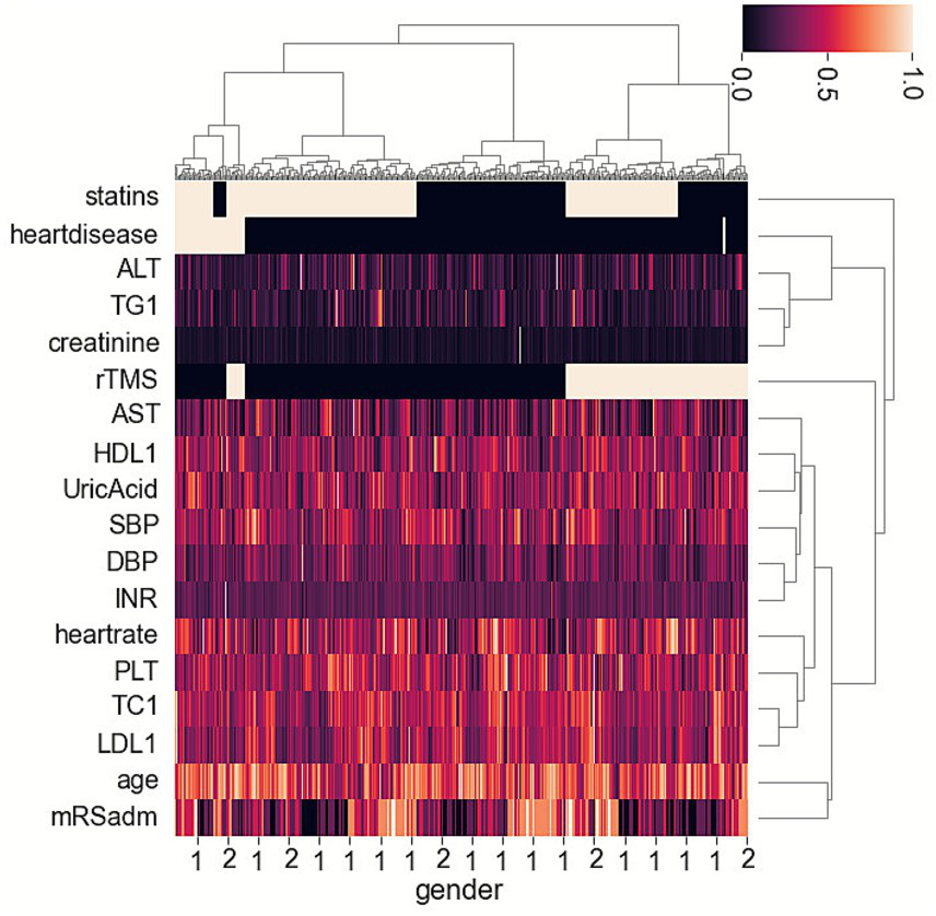 We utilized Python 3.8 for our analysis. For cluster analysis, we first standardized all data using the StandardScaler module from the sklearn library, and then classified data using Hierarchical Clustering methods (AgglomerativeClustering module, sklearn library). The heatmap illustrated the distinct characteristics among the classified patient groups. We compared outcome events across the different identified groups. Grouping can yield clinical significance by clarifying differences in PSD among patient groups. Subsequently, we applied chi-square tests and t-tests to further analyze the factors within the selected groups. Significant differences were found in statin use and rTMS across the Hierarchical Clustering groups. We subsequently validated the impact of statin use and rTMS on the incidence of PSD.