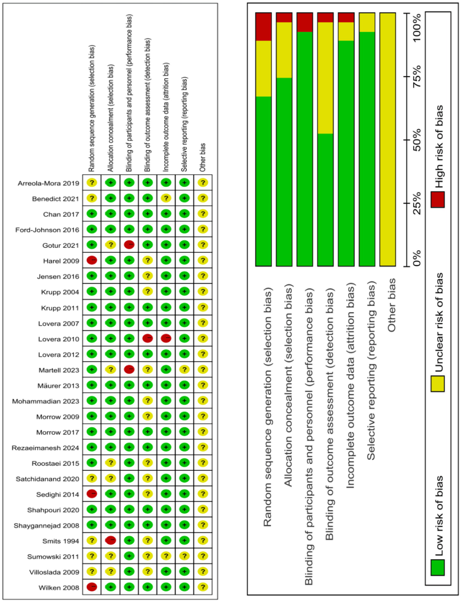 Twenty five RCTs were included in our analysis, involving 1,726 participants. Among these, 940 patients had MS. The treatments investigated included rivastigmine, 4-aminopyridine (4-AP), donepezil, ginkgo biloba, memantine, modafinil, methylphenidate, L-amphetamine, simvastatin, fampridine-SR, dalfampridine, CorSeNs, atomoxetine, and lutein, with dosages ranging from 1.5 to 500 mg. The specific characteristics of the eligible studies are detailed in Table 2. The studies originated from various countries: 1 from India, 1 from the Netherlands, 11 from the United States, 5 from Iran, 1 from Spain, 1 from Germany, 1 from Denmark, 1 from Mexico, and 2 from the United Kingdom. All included studies clearly described the blinding methods. The primary risk of bias stemmed from deviations from the intended interventions. A risk of bias assessment for the selected studies is shown in Figure 2.