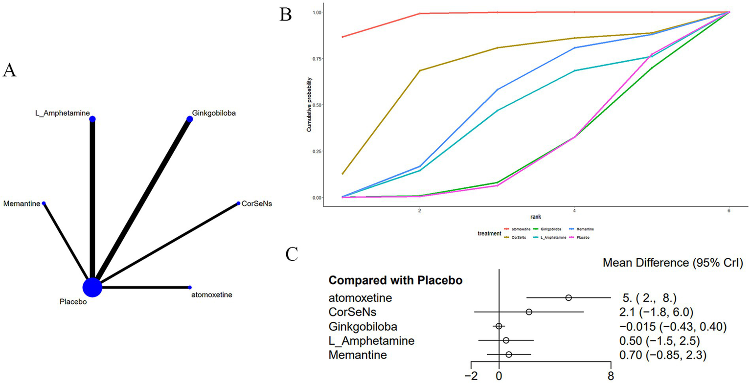 Bayesian network meta-analysis was undertaken with the help of R 4.4.1 (R Foundation for Statistical Computing) with a random-effects model for multiple treatment comparisons. Markov Chain Monte Carlo (MCMC) methods (13) were utilized to obtain the best combined estimates and probabilities for every treatment regimen. Convergence of the model was evaluated using trace plots and Brooks–Gelman–Rubin plots. Continuous outcomes were reported as mean differences (MD) with 95% confidence intervals (CI). The cumulative ranking of interventions was estimated using the Surface Under the Cumulative Ranking Curve (SUCRA) to examine the probability of every treatment being the most effective. Network and funnel plots were generated using STATA 15.0, with a direct macro command loaded. In the network plot, each node corresponds to a treatment being compared. The node size is proportional to the participant number in that treatment arm. Cumulative probability plots were produced through the ggplot2 package. SUCRA rankings were calculated in Stata software and used as the standard to evaluate the effectiveness of pharmacological interventions, with values of 0–1, where a higher value indicates better effectiveness. A funnel plot was generated to detect possible publication bias.