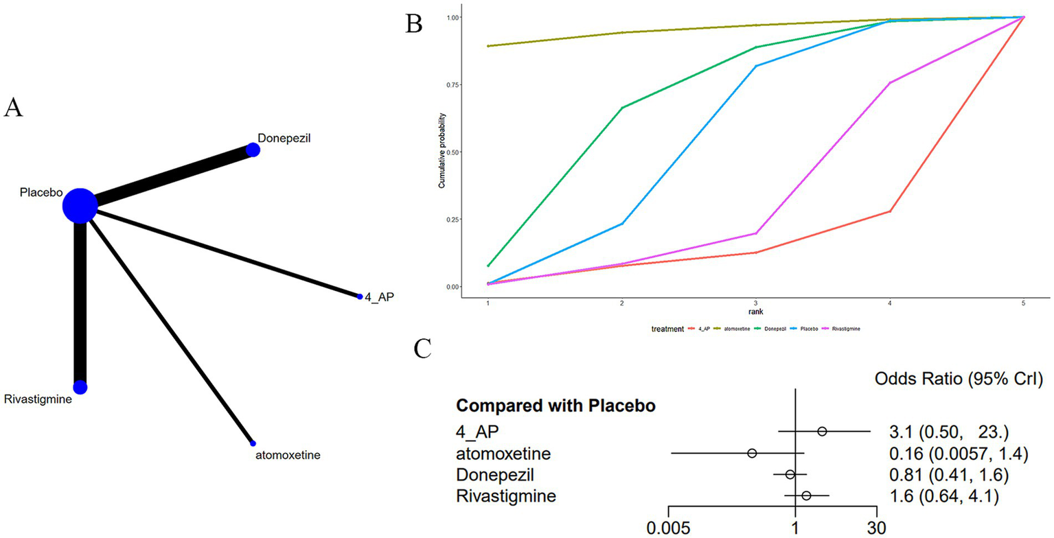 Studies were selected if they satisfied the following criteria: (1) Participants: Adults diagnosed with MS; (2) Interventions: Rivastigmine, 4-aminopyridine (4-AP), donepezil, ginkgo biloba, memantine, modafinil, methylphenidate, L-amphetamine, simvastatin, fampridine-SR, dalfampridine, CorSeNs, atomoxetine, lutein; (3) Control Group: Placebo; (4) Study Type: RCTs; (5) Outcome Measures: Memory, PASAT, SDMT, CVLT, and adverse reactions. Studies were excluded based on the criteria as follows: (1) Duplicate publications; (2) Animal studies, case reports, conference abstracts, reviews, protocols, or studies with incomplete or unavailable full-text data; (3) Studies involving other organic diseases or comorbidities.