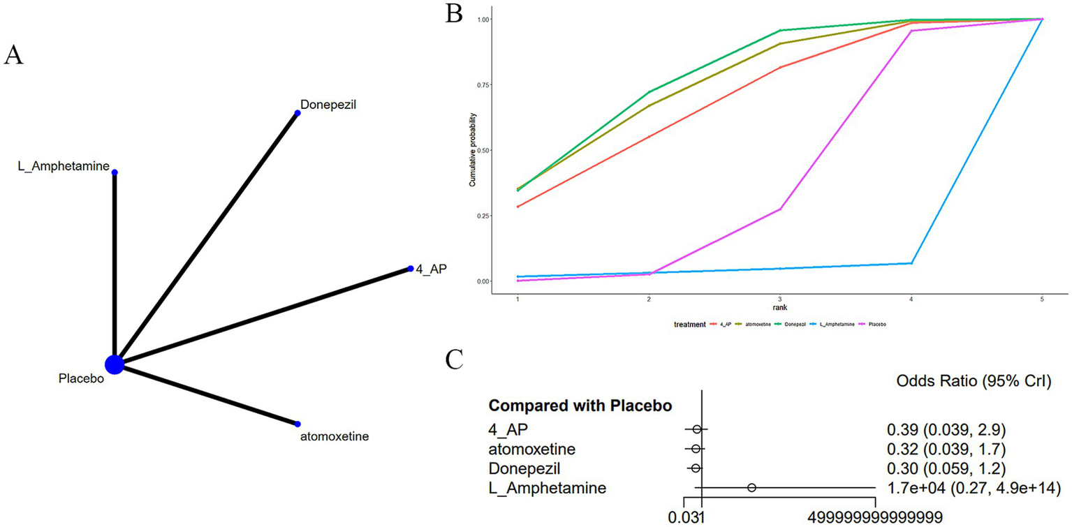 To compare the effects of various pharmacological treatments on partial test results and adverse effects in patients with cognitive dysfunction (CD) induced by multiple sclerosis (MS) through a network meta-analysis.