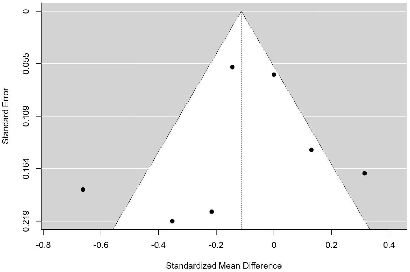 A variety of statistical methods were utilized to evaluate publication bias. The Fail-Safe N test, employing the Rosenthal methodology, was conducted to ascertain the number of additional null studies necessary to render the overall meta-analysis results non-significant. Begg and Mazumdar’s rank correlation test was implemented to assess the relationship between effect sizes and their standard errors, thereby identifying potential asymmetry within the funnel plot. Additionally, Egger’s regression test was performed to evaluate the linear relationship between effect size and precision, offering further insight into potential funnel plot asymmetry (Table 1 and Figure 1). Collectively, these methods provide a thorough assessment of potential publication bias in the analysis (26–28).