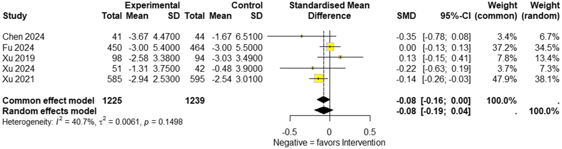 ![Forest plot illustrating the standardized mean difference (SMD) across five studies comparing experimental and control groups. The plot includes studies by Chen 2024, Fu 2024, Xu 2019, Xu 2024, and Xu 2021, each represented with markers and confidence intervals. A negative SMD indicates a favor towards intervention. The common effect model shows SMD as -0.08 [-0.16; 0.00] and the random effects model as -0.08 [-0.19; 0.04]. Heterogeneity statistics are I² = 40.7%, τ² = 0.0061, p = 0.1498.](https://www.frontiersin.org/files/Articles/1649476/fneur-16-1649476-HTML-r1/image_m/fneur-16-1649476-g006.jpg)