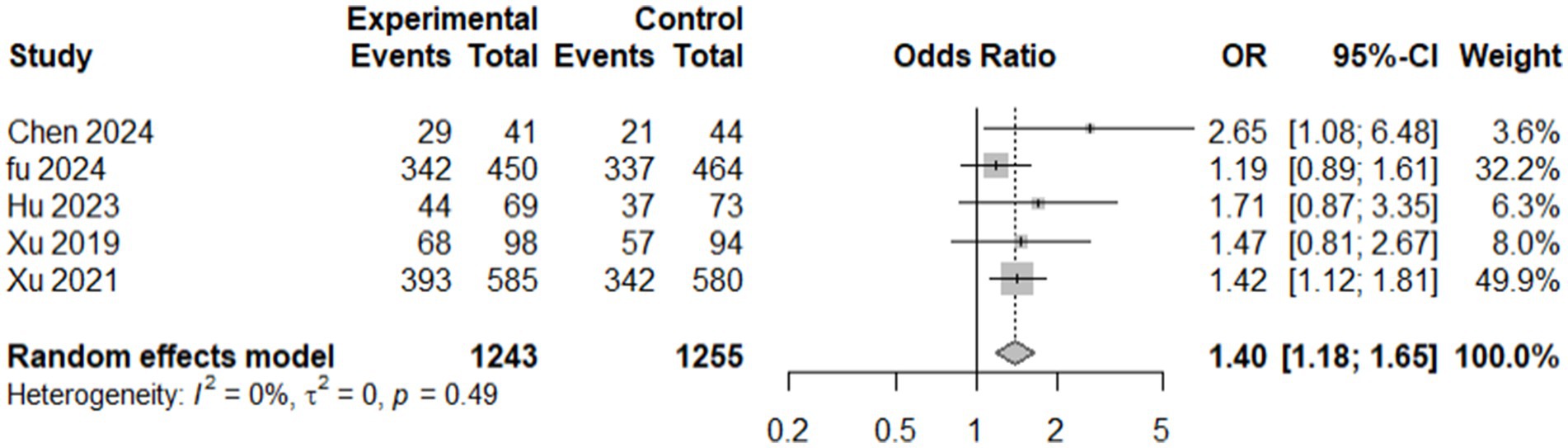 A total of five studies (6, 7, 14, 29–32) reported (mRS) score of ≤ 2 at 90 days, comprising 2,498 participants (1,243 in the intervention group and 1,255 in the control group), revealed that the intervention group had significantly better outcomes than the control group. The random-effects model calculated an odds ratio (OR) of 1.3951 (95% confidence interval [CI]: 1.1783–1.6517, p = 0.0001), suggesting 39.5% higher odds of achieving good functional outcomes in the intervention group than in the control. The heterogeneity analysis indicated no substantial variation among the included studies, with τ2 = 0 and I2 = 0.0%, indicating consistency across studies. The test for heterogeneity (Q = 3.44, p = 0.4871) further supported this finding. These results demonstrated a statistically robust and homogenous improvement in functional outcomes with the intervention at 90 days post-treatment. This evidence underscores the potential benefit of the intervention in achieving better recovery, as measured by the mRS score (Figure 7).