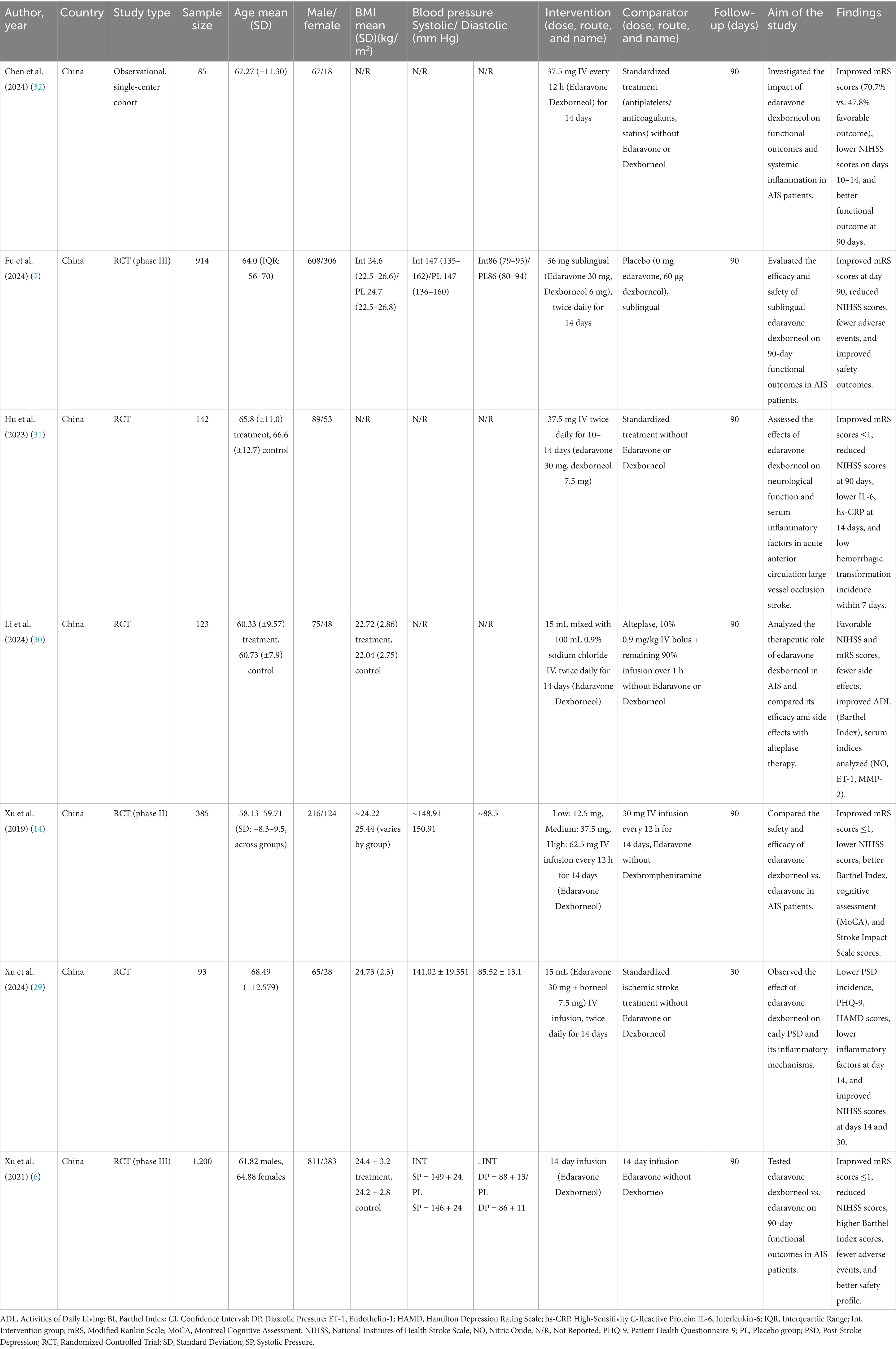 Of the seven included studies, six were parallel RCTs and one cohort study conducted in China that investigated the effects of Edaravone and Dexborneol in ischemic stroke patients (6, 7, 14, 29–32). Six RCTs and one cohort with 2,942 patients were included, of whom 1931 (65.64%) were males. The treatment regimens involved intravenous and sublingual administration of Edaravone and Dexborneol, either alone or in combination with other standard ischemic stroke treatments, for durations ranging from 10 to 14 days. The participant numbers varied from 85 to 1,200, with a mean age of 60–68. These studies consistently reported significant improvements in functional outcomes, including enhanced modified Rankin Scale (mRS) scores and reduced National Institutes of Health Stroke Scale (NIHSS) scores, indicating better stroke recovery. Xu et al. (29) and Li et al. (5, 30) also observed improved activities of daily living (ADL). In contrast, several studies, such as Hu et al. (31) and Xu et al. (29), noted reductions in post-stroke depression (PSD), inflammation, and hemorrhagic transformation. Improvements in cognitive function, including better MoCA and Stroke Impact Scale scores, have also been highlighted in several trials. Additionally, the studies demonstrated a favorable safety profile, with fewer adverse events compared to standard treatments, as noted by Xu et al. (6).
