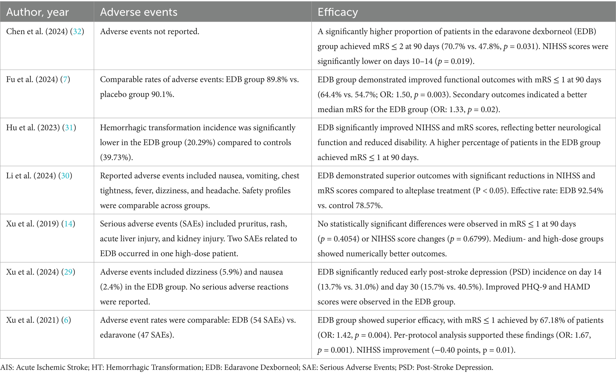 6. Xu, J, Wang, A, Meng, X, Yalkun, G, Xu, A, Gao, Z, et al. Edaravone dexborneol versus edaravone alone for the treatment of acute ischemic stroke: a phase III, randomized, double-blind, comparative trial. Stroke. (2021) 52:772–80. doi: 10.1161/STROKEAHA.120.031197