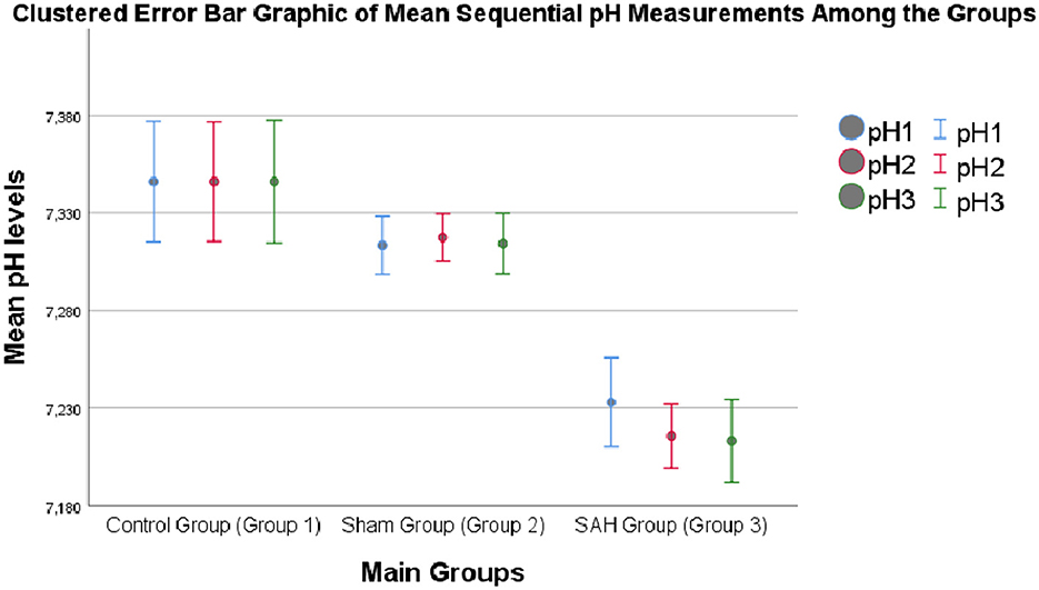 Cerebrospinal fluid (CSF) pH levels were measured on days 1, 7, and 14 following the intervention. The SAH group demonstrated significantly lower CSF pH values compared to both control and sham groups at all time points. The overall mean CSF pH values, calculated as the average of the three sequential measurements, were 7.35 ± 0.02 in the control group, 7.31 ± 0.01 in the sham group, and 7.22 ± 0.03 in the SAH group. Statistical analysis revealed a significant difference in overall CSF pH levels among the groups (Kruskal–Wallis test, p < 0.001). Pairwise comparisons confirmed significant differences between control and sham groups (p = 0.047), control and SAH groups (p = 0.002), and sham and SAH groups (p = 0.002; Mann–Whitney U test). Because this was an exploratory pilot study with small samples, no formal multiplicity adjustments (e.g., Bonferroni/Holm) were applied; exact two-sided p-values are reported descriptively.