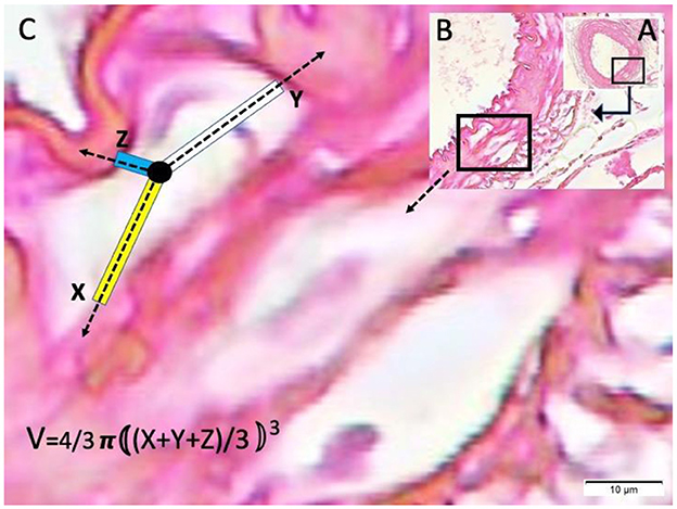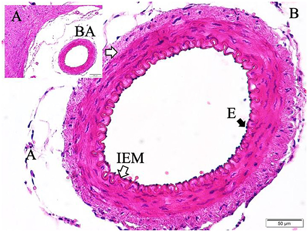 Figure 4. Basilar artery (BA) in the basilar sulcus at the anterior surface of pons (LM, H&E, x4/A) and a magnified view with moderate convoluted inner elastic membrane (IEM), ischemic endothelial cells (E), and minimally contracted muscles in the basilar artery wall in a sham subject (LM, H&E, x20/B). VSI estimation parameters and method are also shown.