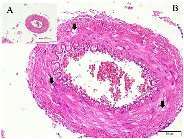 • Vacuolation (Vacuole) Density (VD): Vacuoles were defined as clear, round/oval spaces within endothelial and/or smooth muscle layers on H&E. Vacuoles were counted in three non-overlapping high-power fields ( × 400) per section and normalized to vessel-wall area, expressed as vacuoles/mm2. The mean across fields constituted the per-animal VD.