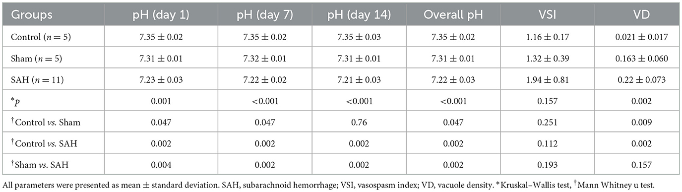 Results: CSF pH was significantly lower in the SAH group than in control or sham-controlled animals (overall mean 7.22 ± 0.03 vs. 7.35 ± 0.02 and 7.31 ± 0.01; p < 0.05). While overall VSI did not differ among the groups, animals with severe acidosis displayed a markedly higher VSI than those with mild acidosis (2.83 ± 0.49 vs. 1.60 ± 0.64; p = 0.041). VD was elevated in both sham-controlled and SAH groups compared with controls (p = 0.009 and p = 0.002). Increased vacuolation in sham-controlled animals suggests that surgical manipulation alone can promote vacuole formation. There was a strong inverse correlation between CSF pH and VD (r = −0.75, p < 0.001), whereas no correlation was found between VSI and VD.