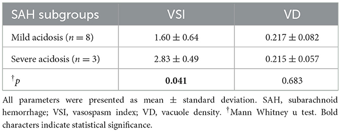 Within the SAH group, animals were stratified according to the severity of CSF acidosis: mild acidosis (CSF pH ≥ 7.20, n = 8) and severe acidosis (CSF pH < 7.20, n = 3). As shown in Table 2, the mean VSI was 2.83 ± 0.49 in the severe subgroup compared with 1.60 ± 0.64 in the mild subgroup, representing a 1.23-unit absolute increase and an ~77% relative rise. Despite the limited statistical power due to the small subgroup size, this difference reached significance (Mann–Whitney U test, p = 0.041) and yielded a large effect size (Cohen's d = 2.2), underscoring potential biological relevance of profound acidosis. Furthermore, VSI values in the severe acidosis subgroup were significantly higher than those observed in both the control and sham groups (Kruskal–Wallis test, p = 0.027; Mann–Whitney U test, p = 0.025 for both comparisons). By contrast, vacuole density did not differ between mild and severe acidosis subgroups (0.217 ± 0.082 vs. 0.215 ± 0.057 vacuoles/mm2, p = 0.683; Table 2), suggesting that the effect of acidosis severity was more pronounced on vasospasm indices than on structural vacuolation.
