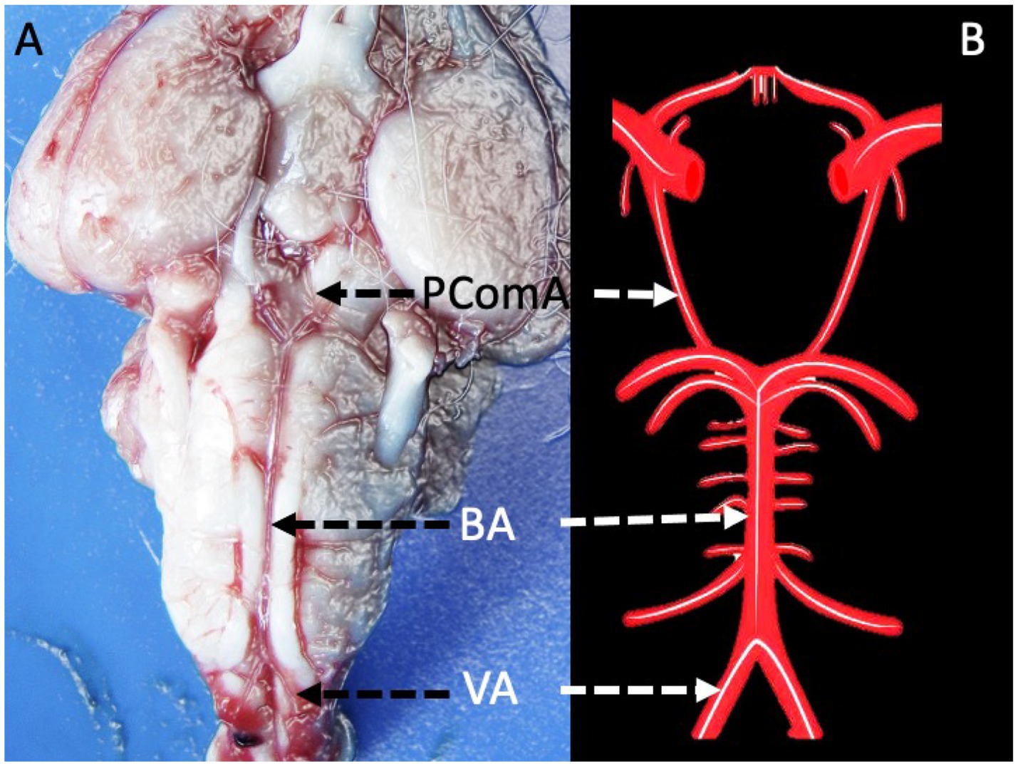 Figure 1. (A,B) Illustrate the anatomical configuration of the basal cerebral arterial system in a healthy brain, highlighting key vessels including the posterior communicating artery (PComA), basilar artery (BA), and vertebral arteries (VA).