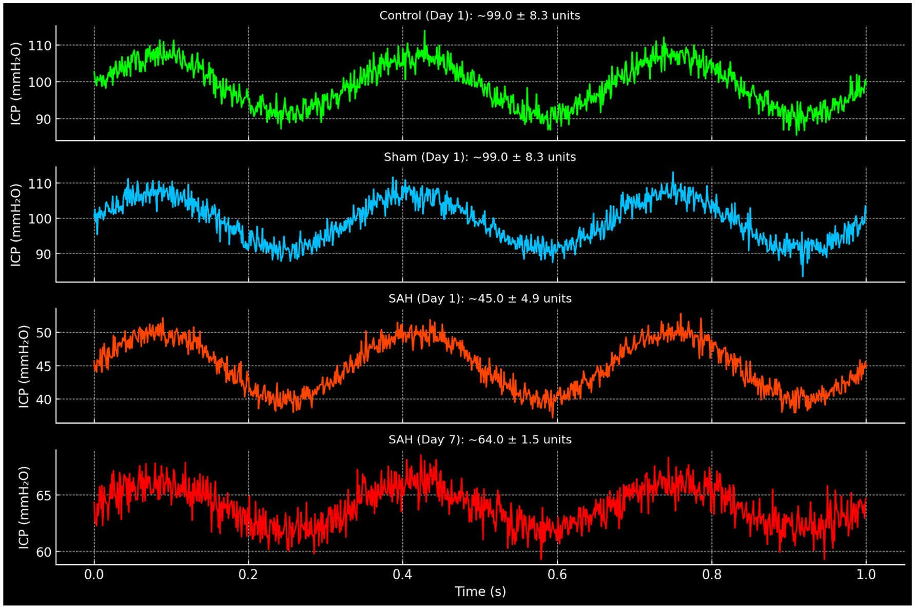 Figure 3. Representative intracranial pressure (ICP) waveforms in control, sham, and SAH groups. Waveforms are displayed in mmH₂O units and annotated with corresponding mean ± SD values derived from experimental data. Control and sham groups at day 1 demonstrated normal cardiac-synchronous pulsations (~99.0 ± 8.3 units). SAH animals exhibited markedly reduced amplitude on day 1 (~45.0 ± 4.9 units). By day 7, SAH animals showed partial recovery (~64.0 ± 1.5 units), though amplitudes remained lower than control and sham values at the same time point (~83 units).