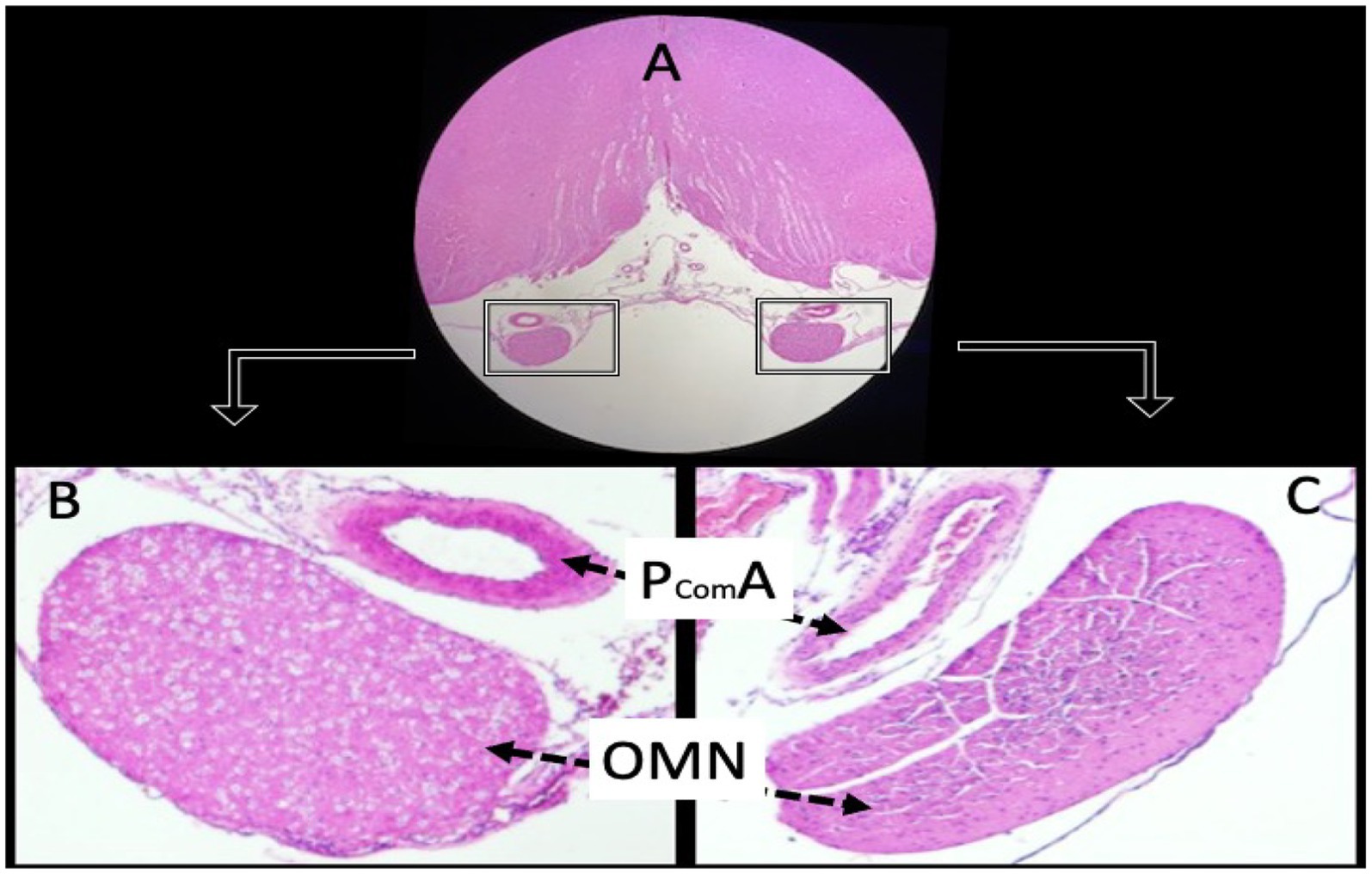 Figure 4. Histological sections of a normal animal demonstrate the anatomical relationship between the oculomotor nerves (OMN) and the posterior communicating arteries (PComA). Panel (A) shows the OMN under low magnification (hematoxylin and eosin, ×4). Panels (B,C) depict the PComA with preserved luminal architecture and intact vascular wall morphology (light microscopy, H&E, ×4).