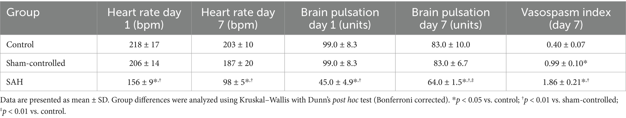 The primary outcome measures were cerebral pulsation amplitude and the posterior communicating artery (PCoA) vasospasm index (VSI), while heart rate changes over time were analyzed as secondary outcomes. Data were summarized as mean ± standard deviation. Given the relatively small sample sizes and the non-normal distribution of several variables, all analyses were conducted using non-parametric statistical methods. Overall group differences for continuous variables were first assessed using the Kruskal–Wallis test. When this analysis indicated a statistically significant difference, Dunn’s multiple comparison post hoc test with Bonferroni correction was applied to identify significant pairwise differences among the three groups (SAH vs. control, SAH vs. sham, and sham vs. control). Within-group changes between day 1 and day 7 were evaluated using the Wilcoxon signed-rank test for paired non-parametric data. A two-tailed p-value <0.05 was considered statistically significant for all analyses. To facilitate interpretation, exact p-values for key comparisons are reported in the Results. Statistical analyses were performed using SPSS version 26.0 (IBM Corp., Armonk, NY, United States).