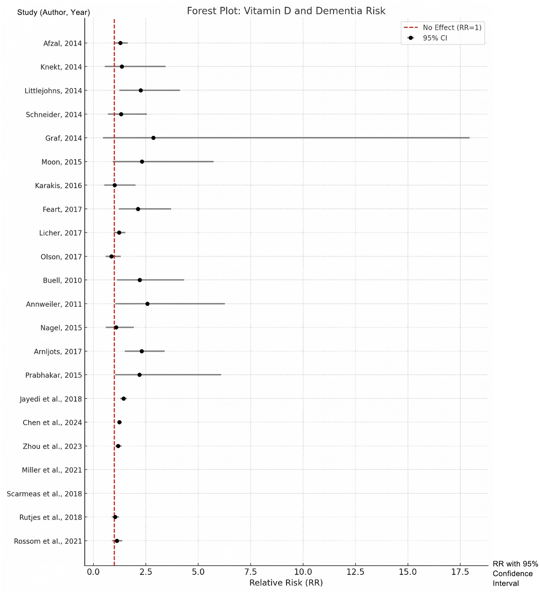 This meta-analysis of observational studies suggests an inverse association between serum vitamin D levels and dementia risk, with a small but consistent dose–response effect. While these findings are robust across subgroups, causality cannot be inferred from observational data. Randomized controlled trials are needed to confirm whether vitamin D supplementation can reduce dementia risk.