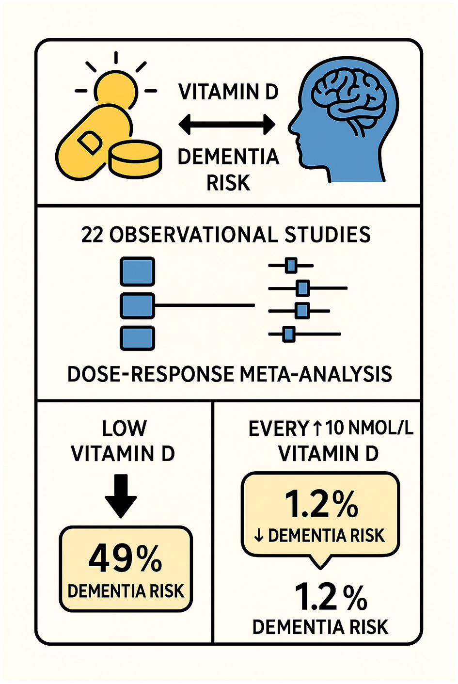 Graphical abstract illustrating the association between serum vitamin D levels and dementia risk. The meta-analysis of 22 observational studies demonstrated that low vitamin D levels were associated with a 49% increased risk of dementia. Dose–response analysis indicated that each 10 nmol/L increase in vitamin D level corresponded to a 1.2% reduction in dementia risk.