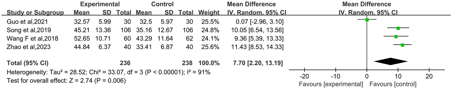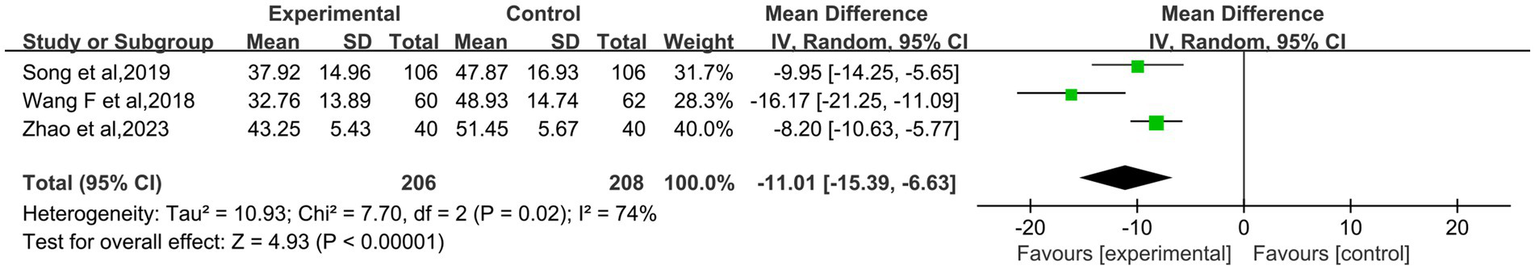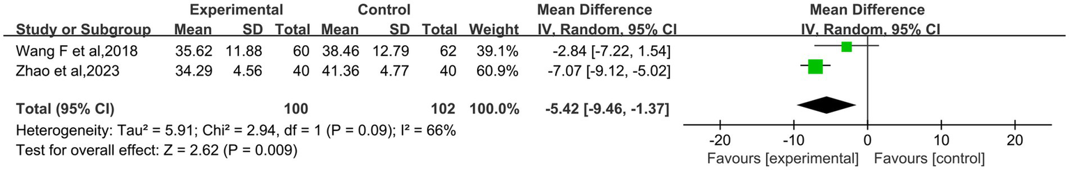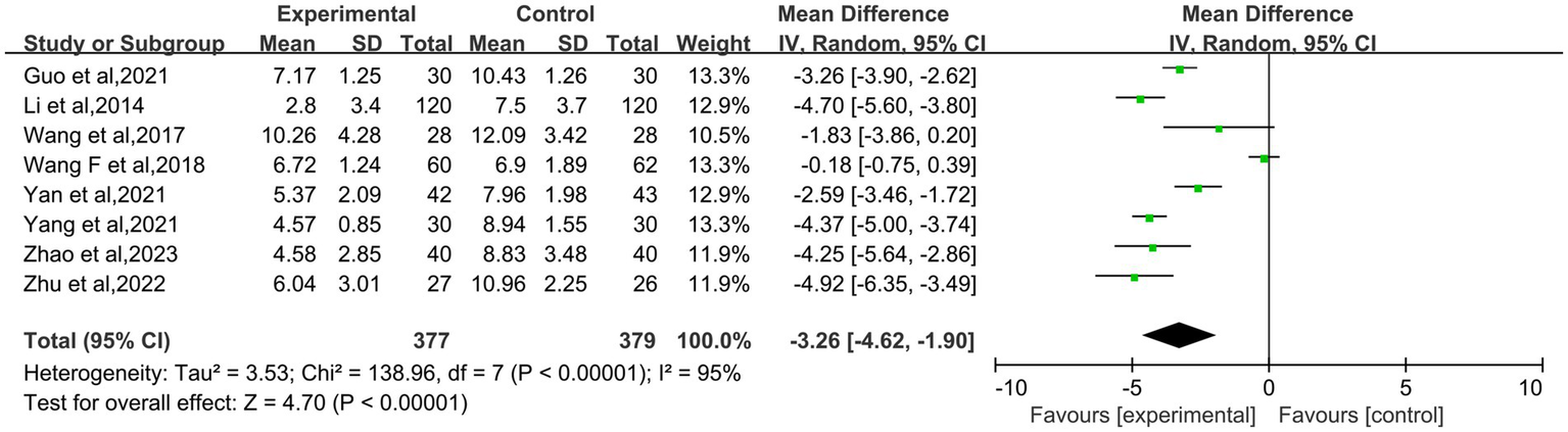 The study comprised nine randomized controlled trials involving 968 people. The results showed that acupuncture was superior to the control group in improving the effective rate (OR: 3.30; 95% CI: 2.18–4.98; p < 0.00001), PSQI score (MD: −3.26; 95% CI: −4.62– −1.90; p < 0.00001), FSH (MD: −11.01; 95% CI: −15.39– −6.63; p < 0.00001), KMI score (p < 0.05), 5-HT (p < 0.05), NE (p < 0.05), MENQOL score (p < 0.05), early-wake score (p < 0.05), sleep actigraphy monitoring (p < 0.05), and Traditional Chinese Medicine symptom scores (p < 0.05) in patients with menopausal insomnia. The two groups had no significant differences in regulating serum E2 (MD: 7.70; 95% CI: 2.20–13.19; p = 0.06) and LH levels (MD: −5.42; 95% CI: −9.46– −1.37; p = 0.009).