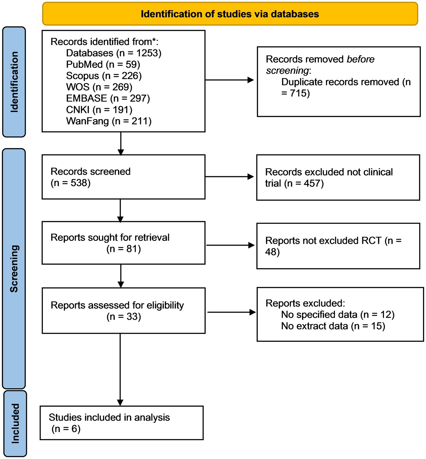 A systematic search was conducted across six databases (PubMed, Scopus, Web of Science, EMBASE, CNKI, and WanFang), yielding 1,253 records. After removing 715 duplicate records, 538 records underwent preliminary screening. Following the exclusion of 457 non-clinical studies, 81 full-text articles were selected for further evaluation. Subsequently, 48 non-randomized controlled trials were excluded, leaving 33 reports for full-text review. After detailed assessment, 27 studies were excluded due to insufficient data or inability to extract relevant outcomes, resulting in the final inclusion of six studies for meta-analysis (Figure 1).