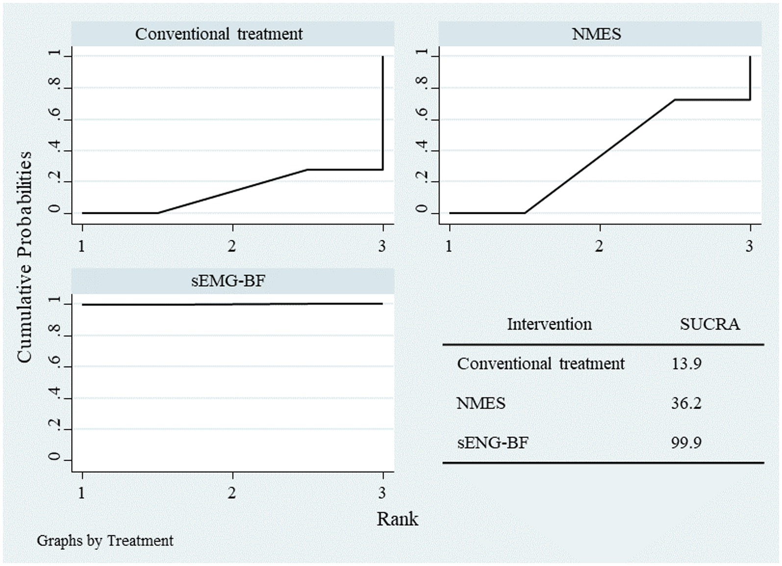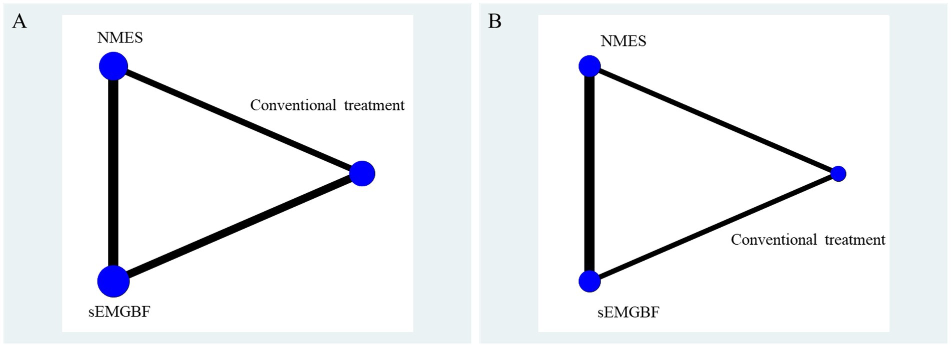 Methods: A systematic review and network meta-analysis were conducted by searching databases, including PubMed, EMBASE, Cochrane Library, Web of Science, and Scopus for prospective randomized controlled trials on the application of sEMG-BF in patients with PSD. We included randomized controlled trials that compared sEMG-BF, NMES, or conventional therapy in patients with PSD. The study focused on the effects of sEMG-BF on electrophysiological outcomes in these patients.