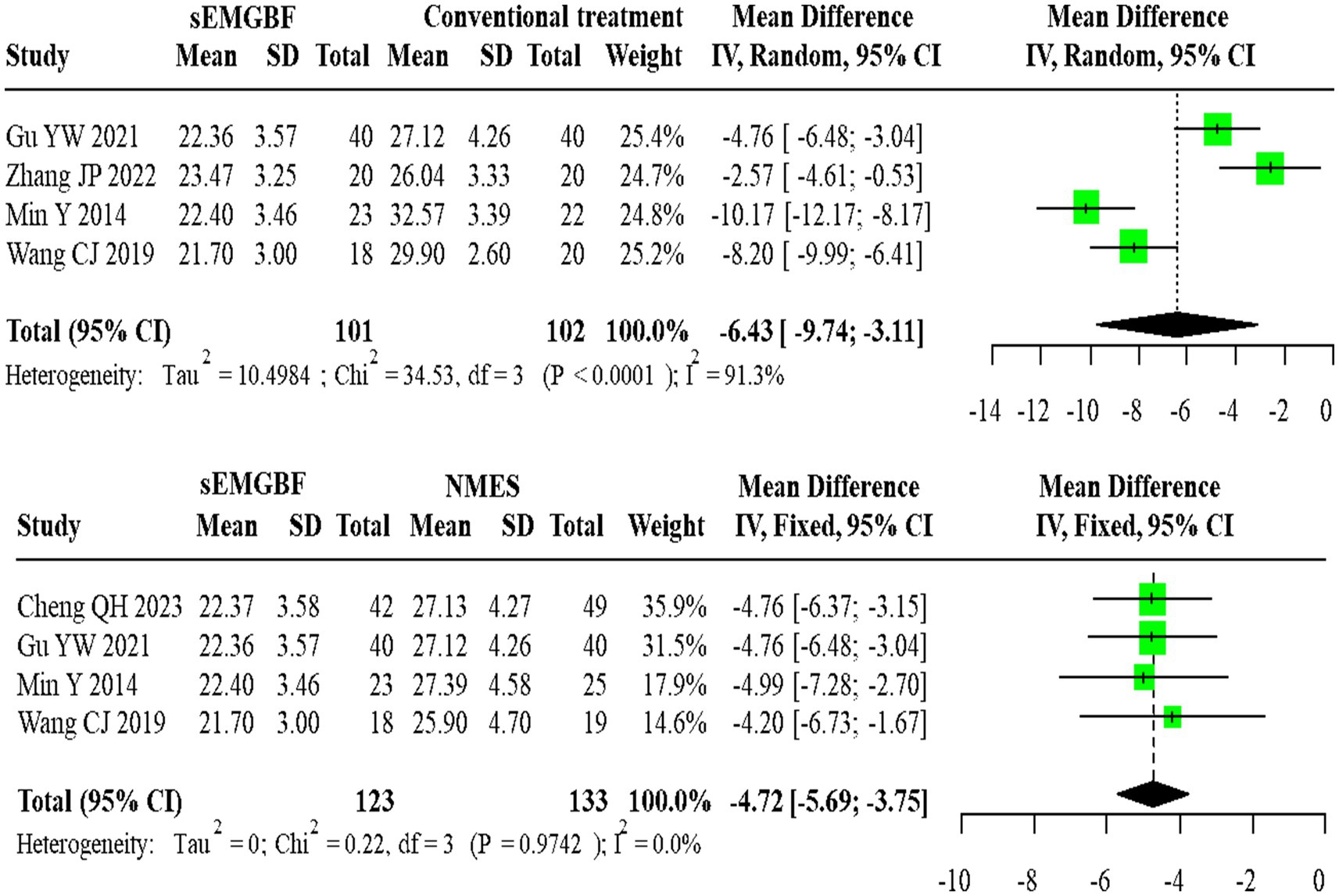 For mean amplitude, four direct comparisons between sEMG-BF and CT showed significant heterogeneity (I2 > 50%), with a pooled MD of 6.45 (95% CI: 3.53–9.38) using a random-effects model. Five direct comparisons between sEMG-BF and NMES also exhibited heterogeneity, yielding an MD of 6.50 (95% CI: 1.75–11.24). Direct meta-analysis confirmed the superiority of sEMG-BF over both CT and NMES in improving mean amplitude (Figure 4).