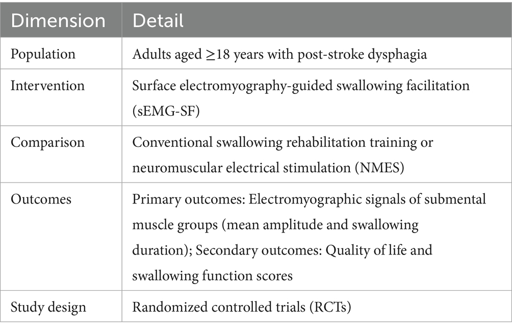 In recent years, with advancements in neuroscience and rehabilitation medicine, various swallowing rehabilitation therapies have emerged. Surface electromyography biofeedback (sEMG-BF) therapy, a novel rehabilitation technique, has gained increasing attention and demonstrated promising potential in the treatment of PSD (10). sEMG-BF enhances the amplitude of electromyographic signals in swallowing-related muscles, improves muscle contraction capacity, and promotes upper esophageal sphincter opening and epiglottis elevation, thereby improving pharyngeal transit efficiency and bolus clearance while simultaneously enhancing airway protection mechanisms during deglutition (11–13). Furthermore, sEMG-BF can augment patients’ self-awareness and control over swallowing movements, promoting active participation in therapy and further optimizing treatment outcomes (14).