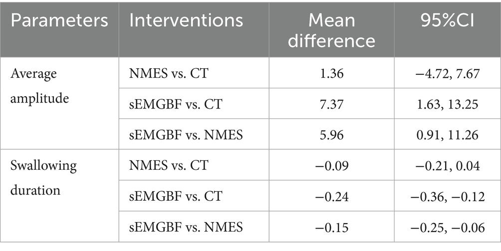 Network meta-analysis (NMA) results ranked the interventions as follows: sEMG-BF > NMES > CT for both mean amplitude (Figure 6) and swallowing duration (Figure 7). The analysis confirmed that sEMG-BF outperformed NMES and CT in improving amplitude and shortening swallowing duration, consistent with direct analysis findings. No significant differences were observed between NMES and CT for either outcome (Table 3).