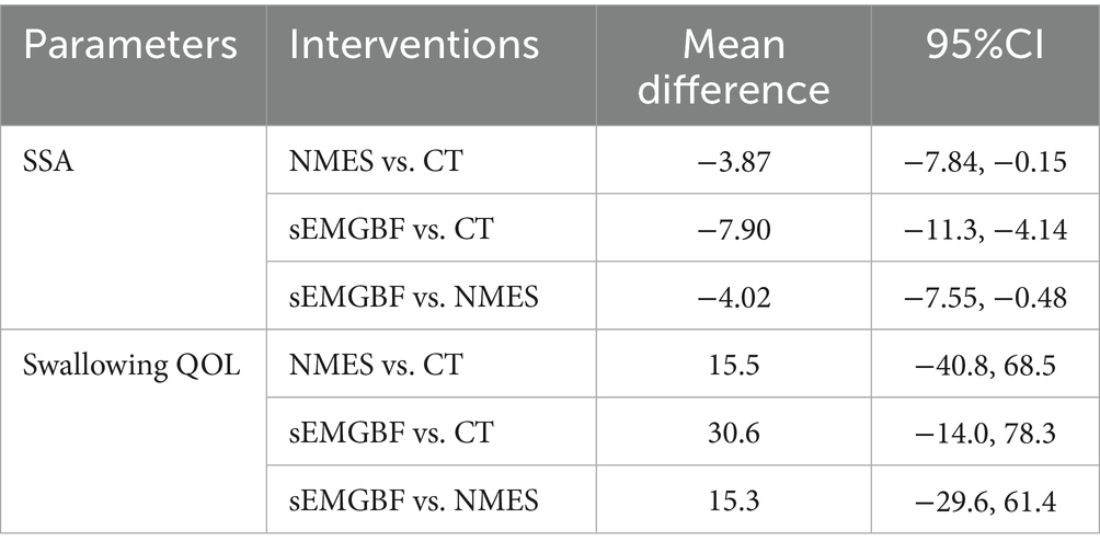 As an emerging rehabilitation technology, sEMG-BF has demonstrated considerable potential in rehabilitation, particularly in the recovery of neurological and motor functions (3). However, systematic evaluation and high-quality evidence are necessary to fully determine its efficacy and optimize its clinical application. This study aimed to conduct a systematic review and network meta-analysis to thoroughly investigate the therapeutic effects of sEMG-BF in PSD, clarify its efficacy advantages, and provide high-quality evidence to support clinical practice. The results suggest that sEMG-BF was superior to conventional therapy and NMES in improving swallowing function and sEMG parameters; however, the overall quality-of-life effects were not statistically significant, and the estimates were limited due to small sample sizes and heterogeneity. Specifically, sEMG-BF significantly increased the mean amplitude and reduced swallowing duration in sEMG metrics. Regarding swallowing function, sEMG-BF markedly improved the SSA score. In terms of quality of life, some studies suggested improvement with sEMG-BF; however, the pooled estimate did not achieve statistical significance, indicating uncertainty about this outcome. These findings indicate that sEMG-BF offers substantial clinical advantages in the treatment of PSD.