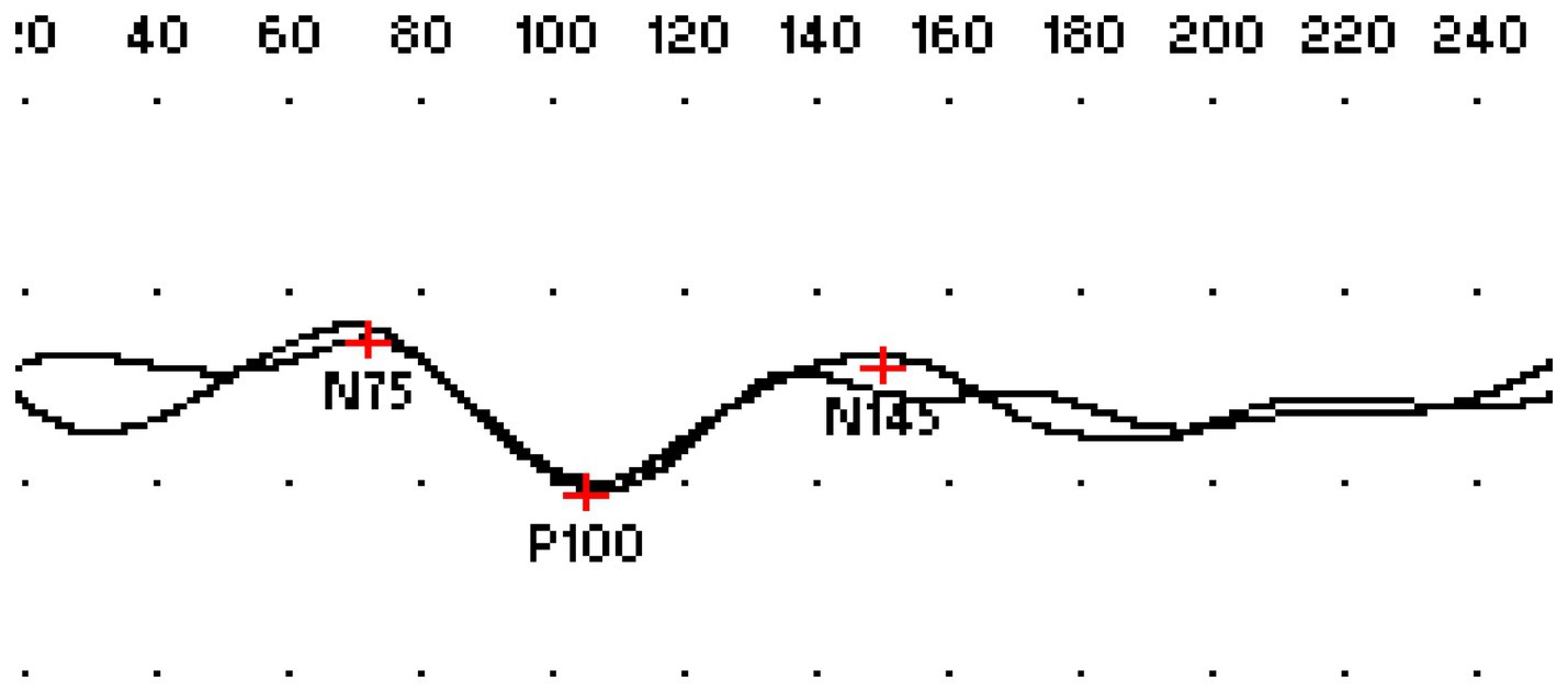 At baseline, the median P100 latency was 107 ms, the median N75–P100 amplitude was 7.92 μV, and the median P100–N145 amplitude was 9,155 μV. At follow-up, the median P100 latency increased to 114 ms, the median N75–P100 amplitude increased to 7,975 μV, and the median P100–N145 amplitude decreased to 8,425 μV (Table 1).