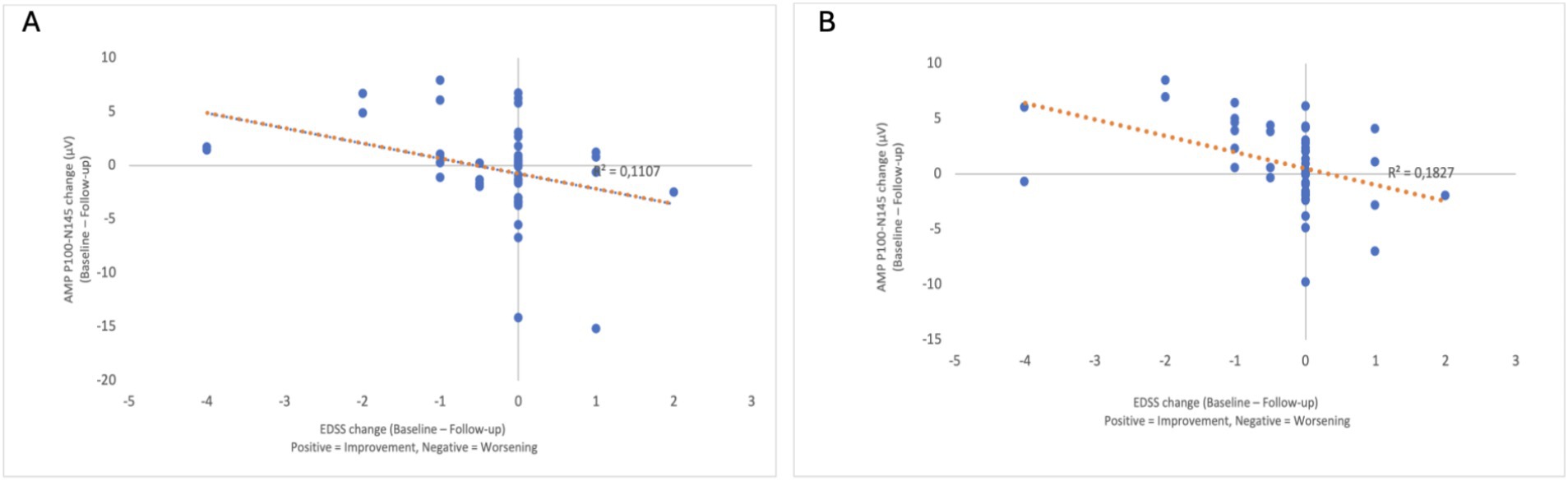 Two scatter plots labeled A and B show the relationship between AMP P100-N145 change (microvolts) and EDSS change (baseline minus follow-up). Both plots depict negative trends with correlation coefficients R² of 0.1107 and 0.1827, respectively. Orange dotted lines represent trend lines. Data points are scattered around these lines, indicating a correlation between the variables.