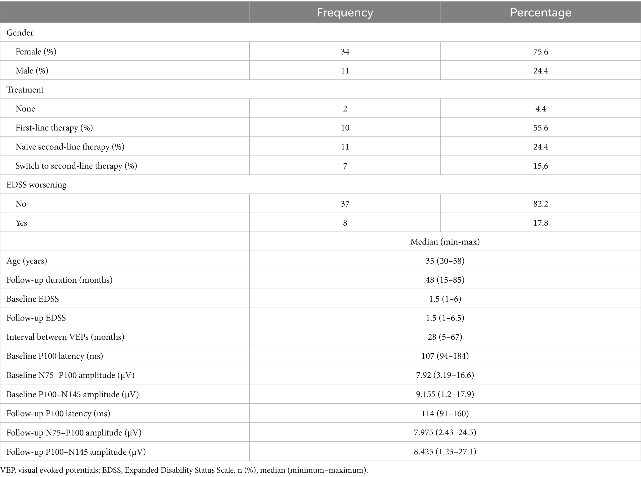 A total of 45 patients with RRMS, contributing 90 eyes, were included in the study. The median age of the cohort was 35 years, and 75.6% were female. The median follow-up duration was 48 months (range: 15–85 months), and the median interval between the two VEP assessments was 28 months (range: 5–67 months). In terms of treatment status, 4.4% of patients were untreated, 55.6% were receiving first-line therapies, 24.4% were naive to second-line therapies, and 15.6% had switched to a second-line therapeutic agent. During the follow-up period, EDSS progression was observed in 17.8% of patients, while 82.2% remained clinically stable. At baseline, the median EDSS score was 1.5 (range: 1–6), with a slight increase to 1.5 (range: 1–6.5) at follow-up (Table 1).