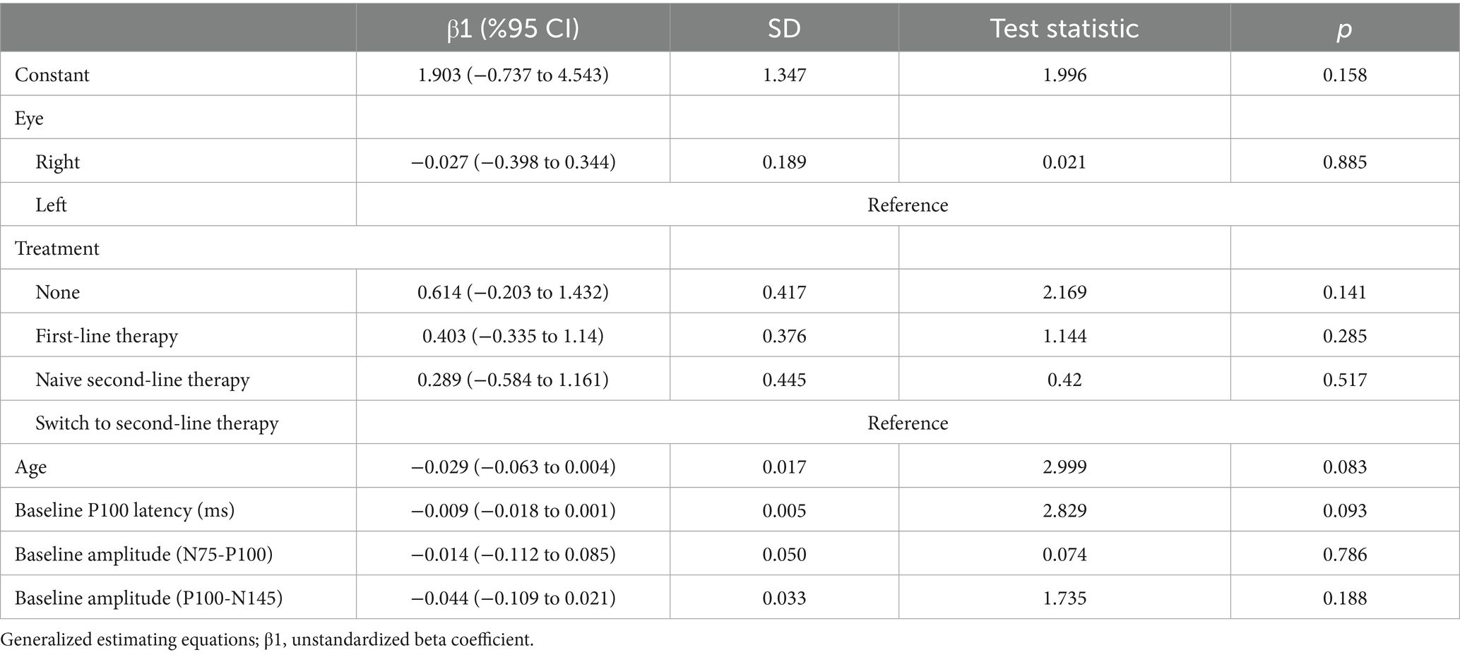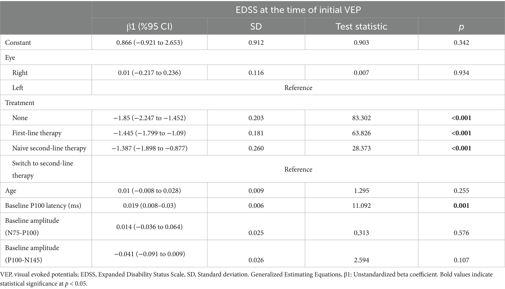 A separate GEE model tested whether baseline VEP and demographic characteristics predicted EDSS changes, but no significant associations were found (all p > 0.05) (Table 5).