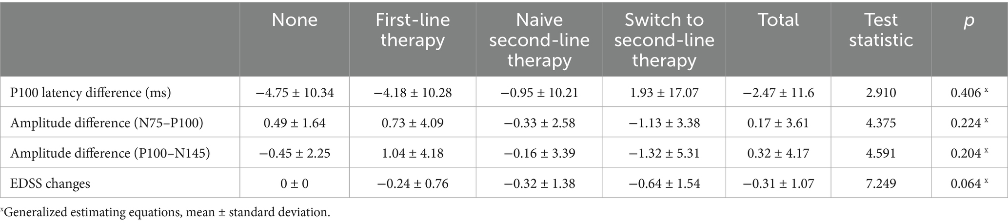 In addition to our primary results, we also investigated how changes in VEP parameters varied with DMT status to gain initial insights into treatment response and disease behavior. Although the observation period was insufficient to assess long-term treatment efficacy, we believe that the amplitude changes observed in the different treatment subgroups may reflect inter-individual differences in the natural history of the disease. In particular, patients switched to second-line therapies showed a greater reduction in P100–N145 amplitude, whereas patients receiving first-line therapies showed relative stability or even an increase. Although these differences did not reach statistical significance, they may reflect variability in individual disease progression and emphasize the potential role of VEP amplitude in detecting subclinical progression, consistent with previous observations of differential treatment effects in MS pathophysiology and disease activity patterns (28).