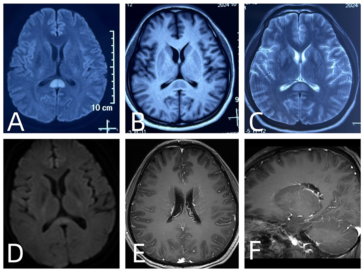 Figure 1. (A) diffusion-weighted imaging (DWI): hyperintense signal in the splenium of the corpus callosum. (B) T1-weighted imaging (T1WI): hypointense signal in the splenium of the corpus callosum. (C) T2-weighted imaging (T2WI): hyperintense signal in the splenium of the corpus callosum. (D) Follow-up DWI: resolution of the previously observed hyperintense signal in the splenium of the corpus callosum. (E, F) Post-contrast imaging: linear perivascular enhancement radiating outward from the lateral ventricles.