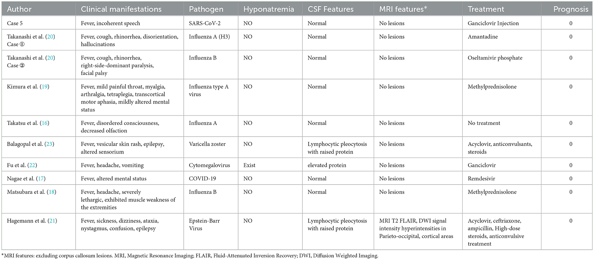 For the viral encephalitis cohort, a total of 10 cases were collected, including one retrospectively enrolled inpatient case from Huashan Hospital of Fudan University and nine cases identified through PubMed database search of viral encephalitis with concomitant RESLES (16–23). Inclusion criteria for viral encephalitis: supported by etiological evidence, presenting with neurological symptoms of encephalitis, exclusion of other diseases, and imaging findings consistent with RESLES (Table 2). The cases of viral encephalitis had clear evidence of the pathogen and other diseases were excluded.
